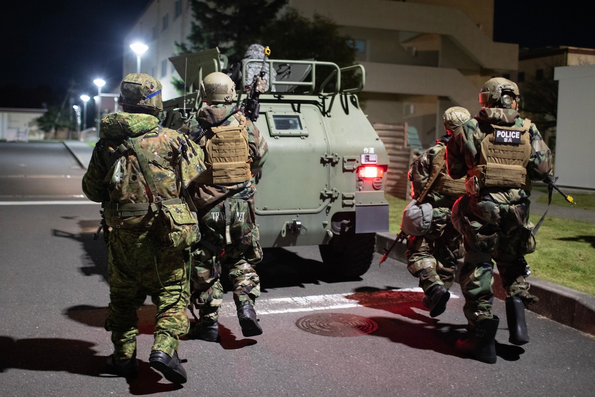 U.S. and Japanese defenders conduct a secondary sweep during a combined arms attack drill as part of the U.S.-Japan Guard and Protect joint field training, incorporated into Exercise Beverly Morning 24-1 at Yokota Air Base, Japan, Oct. 24, 2023. Throughout Exercise Beverly Morning, Wing Inspection Team members posed as opposing forces, allowing for around-the-clock events that breached base security and delivered realistic threats to the bilateral defenders. (U.S. Air Force photo by Yasuo Osakabe)