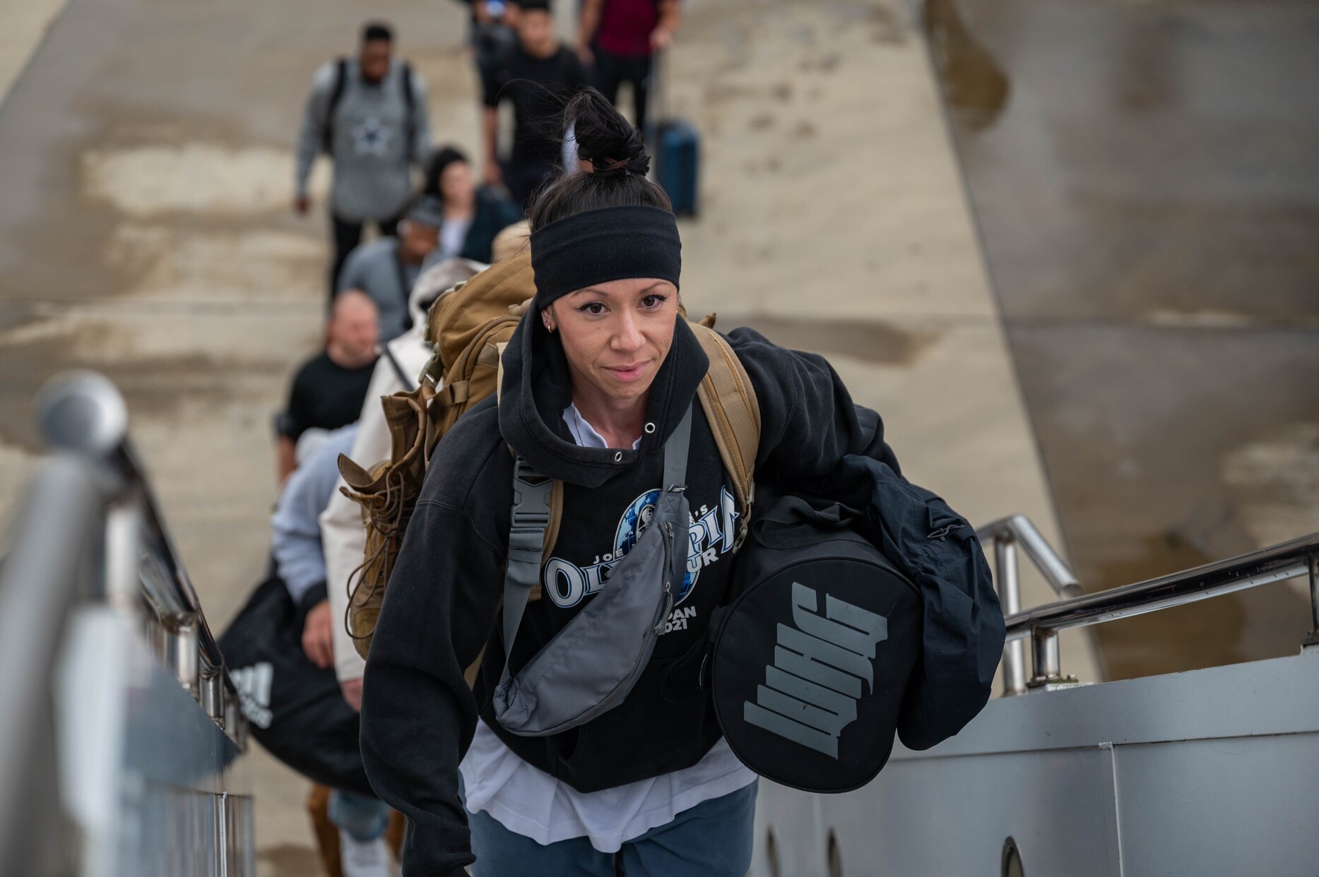 U.S. Air Force Staff Sgt. Catalina Waller, 51st Maintenance Squadron aircraft structural maintenance craftsman, boards a commercial KDC‐10 tanker aircraft prior to take‐off at Osan Air Base, Republic of Korea, Nov. 6, 2023. The aircraft can carry 247,000 pounds of fuel for refueling plus up to 100,000 pounds of freight or passenger payload. Over 40 participating members of Commando Sling 23 boarded this aircraft and took part in the first ever Air Force contracted aerial refueling of their fighter aircraft, highlighting the innovative initiatives for problem resolution. (U.S. Air Force photo by Airman 1st Class Chase Verzaal)