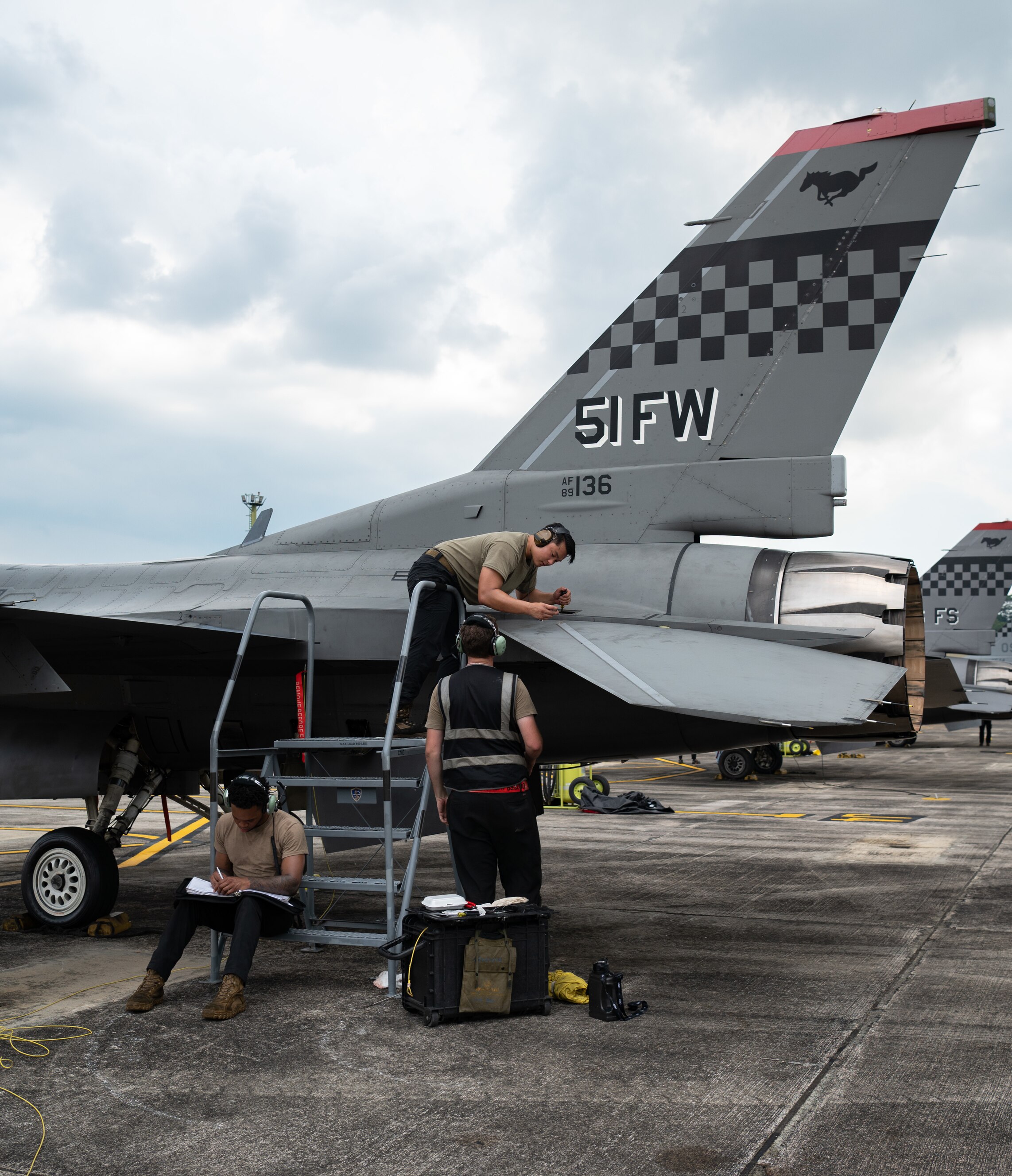 U.S. Air Force maintainers with the 36th Fighter Generation Squadron, Osan Air Base, Republic of Korea, perform a pre-flight maintenance inspection on a U.S. Air Force F-16 Fighting Falcon assigned to 36th Fighter Squadron, during Commando Sling 23 at Lebar Air Base, Republic of Singapore, Nov. 15, 2023. CS23 is a Pacific Air Forces sponsored bilateral training event with the Republic of Singapore Air Force designed to increase interoperability and improve alliance capability. (U.S. Air Force photo by Staff Sgt. Pedro Tenorio)