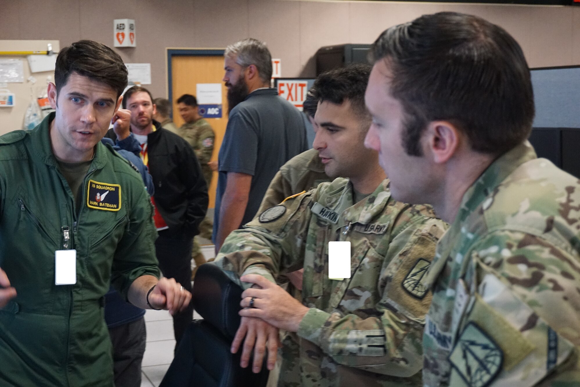 U.S. Army Soldiers and a Royal Air Force MQ-9 pilot discuss simulator functions during Virtual Flag: Coalition at the 705th Combat Training Squadron, also known as the Distributed Mission Operations Center, at Kirtland Air Force Base, New Mexico, Oct. 23 – Nov. 3, 2023. Exercise VF:C serves as a train as you fight exercise by integrating the full spectrum of air, land, surface, space, and cyber warfighters in a virtual battlespace in joint and coalition environments; forces from the United States, United Kingdom, Australia, and Canada participated. (Security badges “whited out” and screens were blurred for security reasons) (U.S. Air Force photo by Ms. Deb Henley)