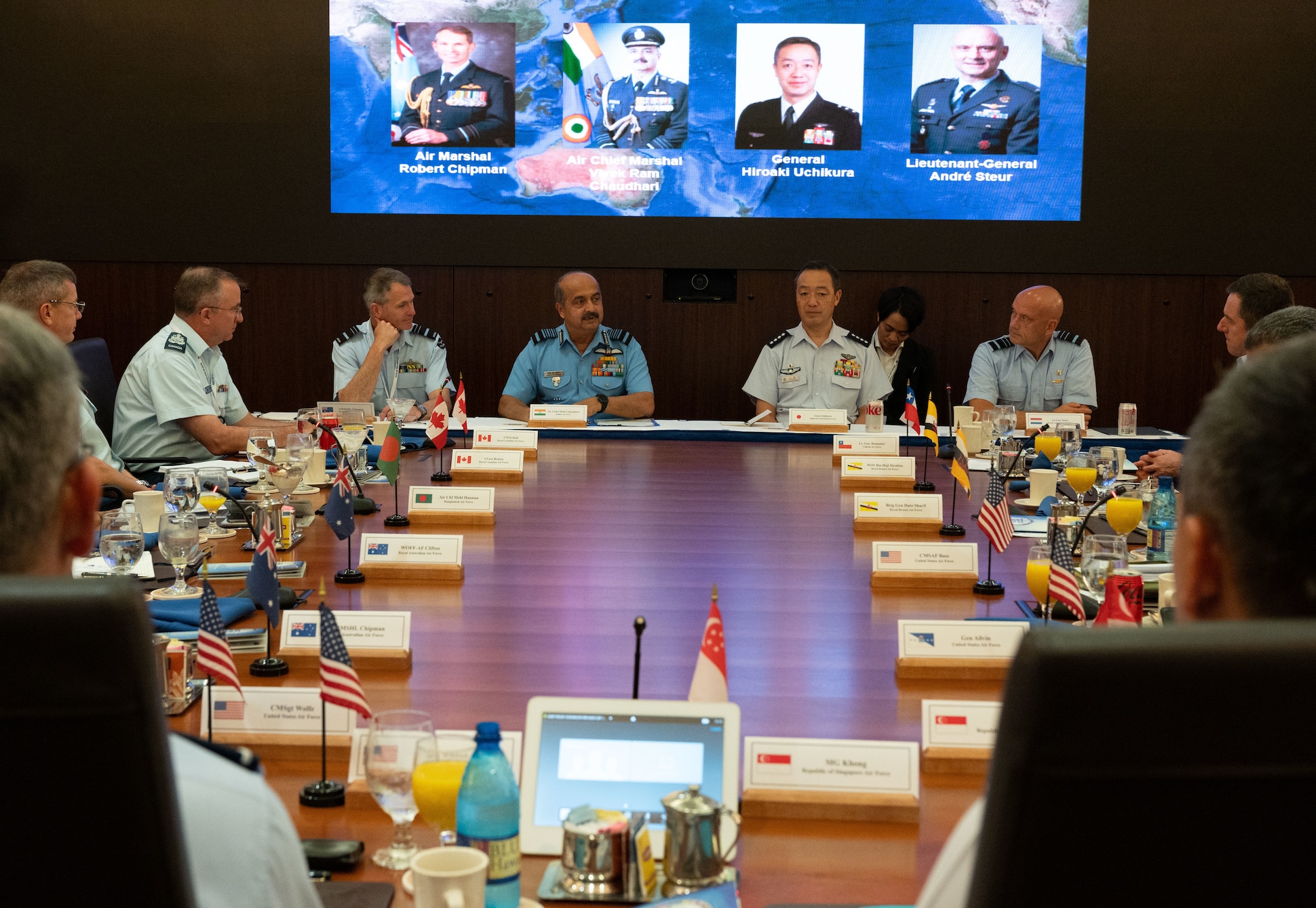 Air chiefs from Australia, India, Japan, and Netherlands provide remarks during a Regional Security Panel for the Pacific Air Chiefs Symposium 2023 at Joint Base Pearl Harbor-Hickam, Hawaii, Nov. 14, 2023. During the symposium, air chiefs across the region discussed topics that relate to a free and open Indo-Pacific, regional security, and built upon bilateral and multilateral relationships. The senior leaders also focused on applying global lessons from recent events and the necessity to preserve peace and prevent conflict in the region. (U.S. Air Force photo by Tech. Sgt. Hailey Haux)