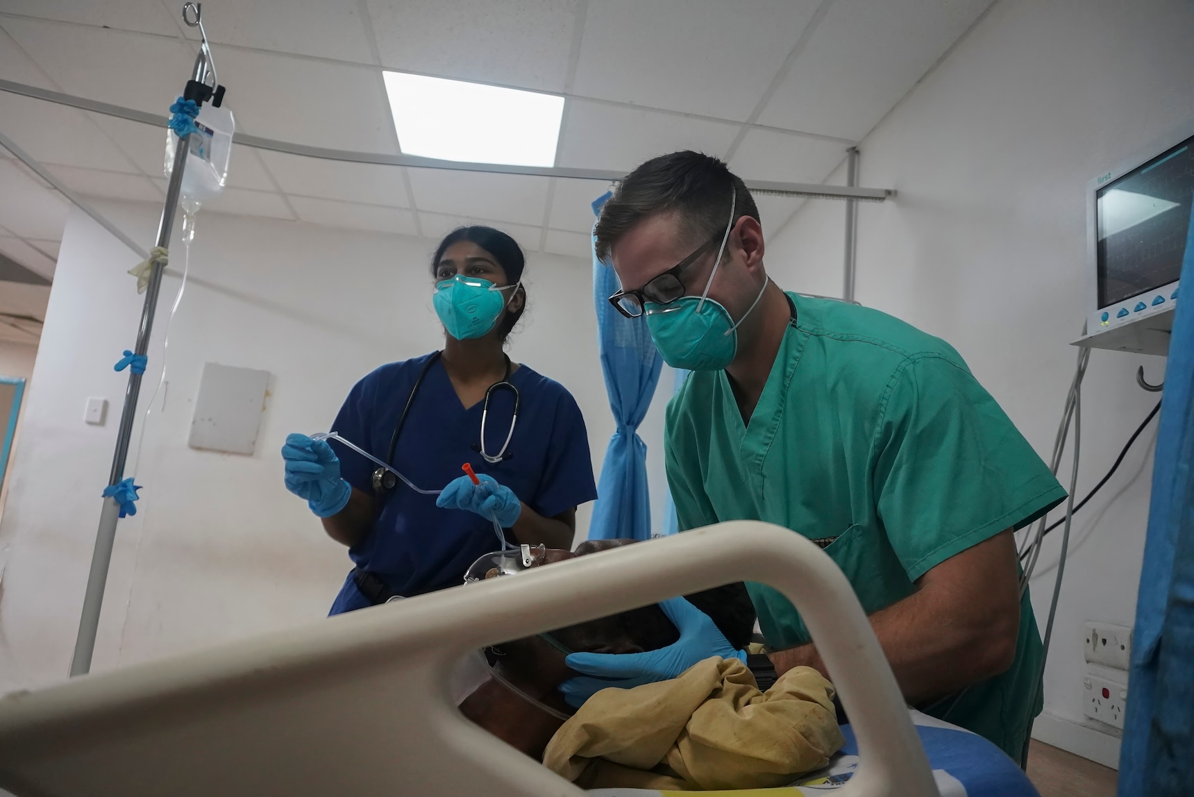 (r) U.S. Army Staff Sgt. Bryan Lehmannorth, healthcare sergeant, 8th Forward Resuscitation and Surgical Detachment, 18th Medical Command, works alongside a hospital staff member to treat a victim of a machete attack during the inaugural Papua New Guinea Trauma Rotation in Port Moresby General Hospital at Port Moresby, Papua New Guinea, Dec. 7, 2023. The Trauma Rotation follows the recent signing of the Defense Cooperation Agreement between the U.S. and Papua New Guinea; it is a first-of-its-kind engagement between the U.S. Army and Papua New Guinea, which mutually offers parties the a chance to exchange medical expertise and techniques in an austere environment. (U.S. Army photo by Sgt. 1st Class Timothy Hughes/Released)