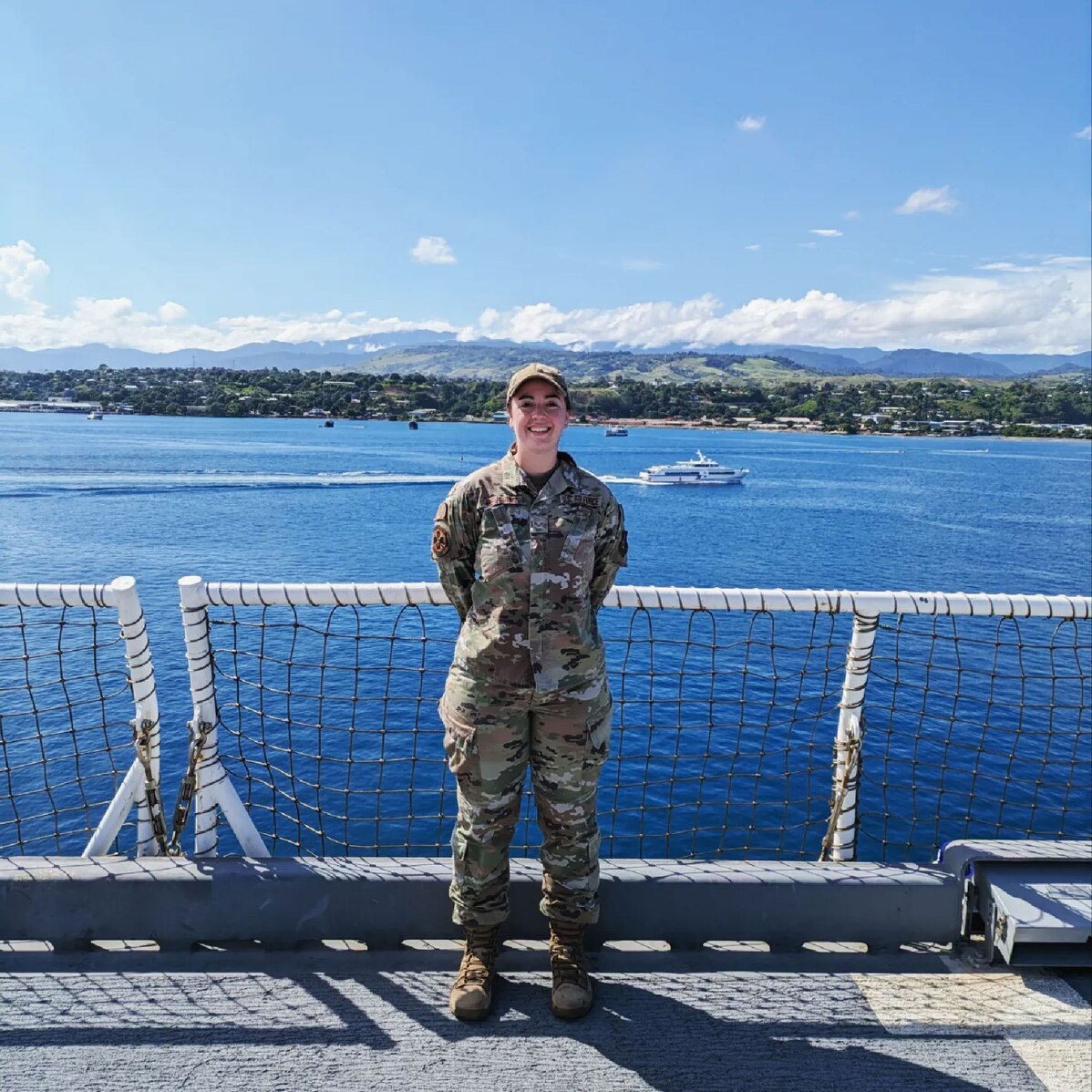 U.S. Air Force Senior Airman Sammi-Joy Severino poses for a photo aboard the United States Navy Ship Mercy during Pacific Partnership 24-1, Nov. 30, 2023. Severino joined medical personnel from other U.S. military branches and nations aboard the Mercy to provide medical care to the people of the Solomon Islands. (U.S. Air Force courtesy photo by Senior Airman Sammi-Joy Severino)