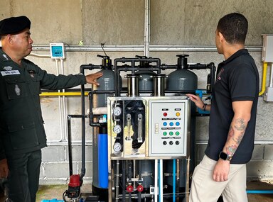 Thailand Border Patrol Police School Principal Lt. Col. Taksin Boonrod and U.S. Special Operations Command Pacific Civil Affairs Team-Thailand medic showcase the newly installed water purification system during a donation ceremony, at the Ban Na Ma-Un School, Chiang Mai Province, Thailand, Nov. 30, 2023. The donation project coordinated by the Civil Affairs team supports the Ministry of Education’s initiative to improve the school’s infrastructure by providing consistent and reliable power. U.S. Civil Affairs teams partner with communities around the world to increase stability, enable local governments, and improve quality of life for civilians. (Courtesy Photo)