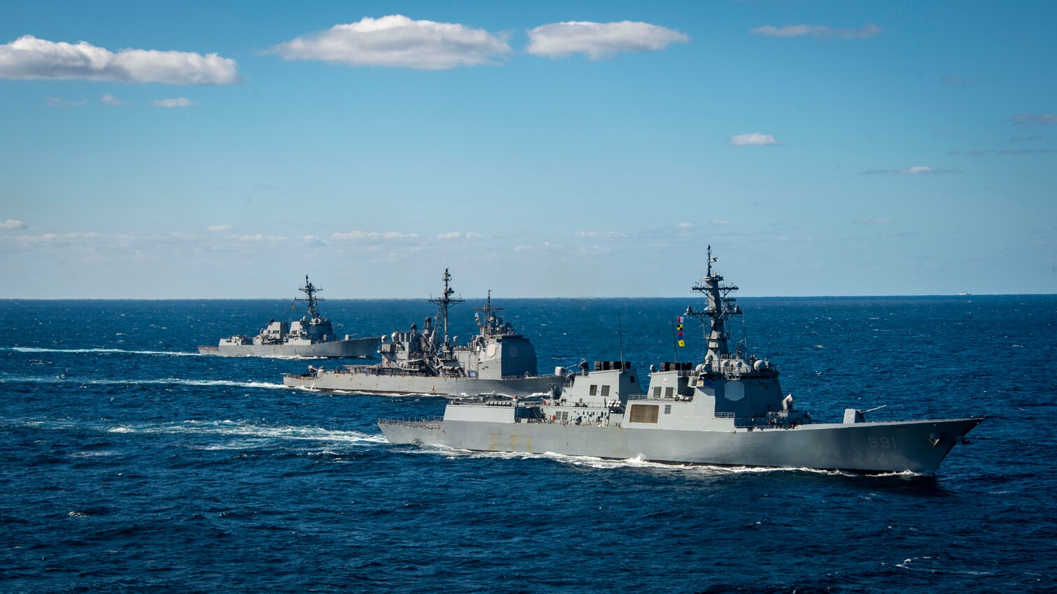 From right to left, the Sejong the Great-class guided-missile destroyer ROKS Sejong the Great (DDG-991) from the Republic of Korea Navy, the Ticonderoga-class guided-missile cruiser USS Princeton (CG 59), the Arleigh Burke-class guided-missile destroyer USS Kidd (DDG 100), sail together during a trilateral exercise, Jan. 16. The exercise allowed maritime forces from Japan, Republic of Korea, and U.S. to train together to enhance coordination on maritime domain awareness and other shared security interests. Vinson, flagship of Carrier Strike Group ONE, is deployed to the U.S. 7th Fleet area of operations in support of a free and open Indo-Pacific. (U.S. Navy photo by Mass Communication Specialist 2nd Class Isaiah B. Goessl)