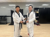 Yi Yong-son (left), a 7th degree Taekwondo black belt, presents a black belt to Sgt. Robert J. Errington (right) from the 59th Chemical, Biological, Radiological, Nuclear (CBRN) Company (Hazards Response). Errington earned his black belt in six months. Courtesy photo.