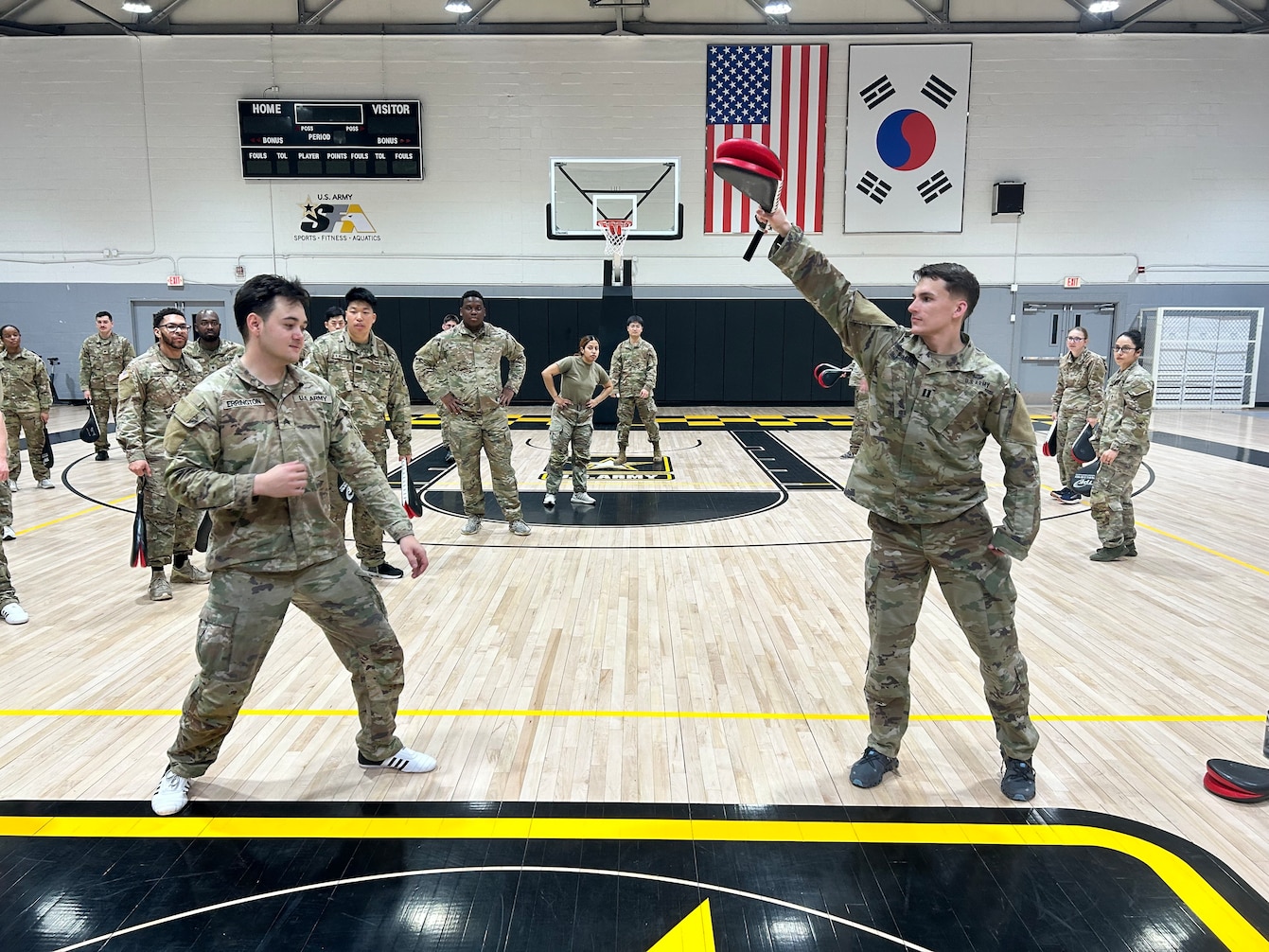 Capt. Evan P. Shortsleeve (right), the commander of the 59th Chemical, Biological, Radiological, Nuclear (CBRN) Company (Hazards Response), holds a pad for Sgt. Robert J. Errington (left). Errington took first place during the international competition at the Kukkiwon, the World Taekwondo Headquarters in Seoul. Courtesy photo.
