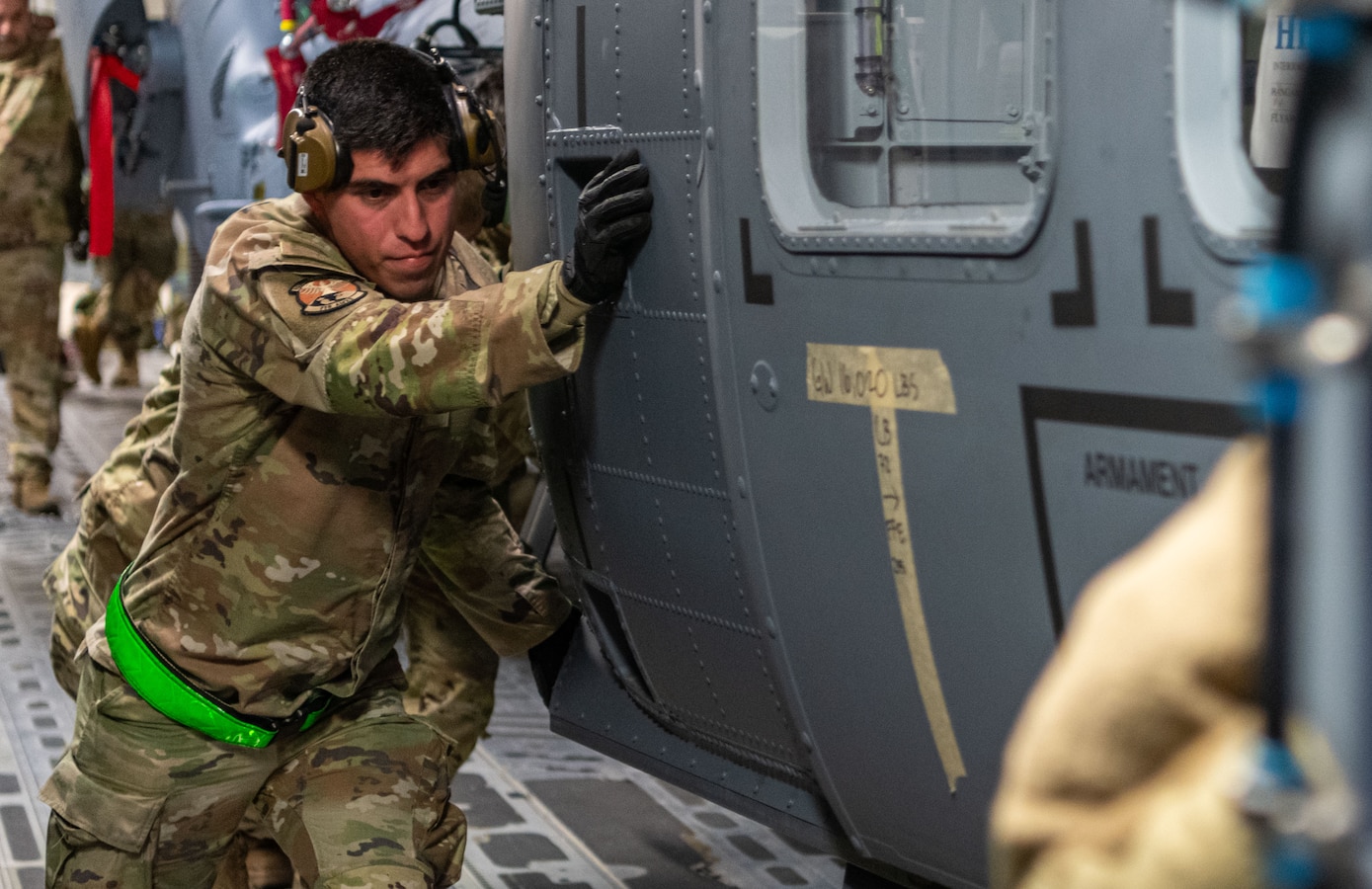 U.S. Air Force Airman 1st Class Julio Mejia Larez, 718th Aircraft Maintenance Squadron HH-60 avionics apprentice, assists in the offloading of an HH-60W Jolly Green II at Kadena Air Base, Japan, Jan. 26, 2024. The 718th AMXS is a vital component to HH-60 operations, performing routine maintenance operations to ensure HH-60 operators are safe and capable of conducting emergency response operations. (U.S. Air Force Airman 1st Class Jonathan R. Sifuentes)