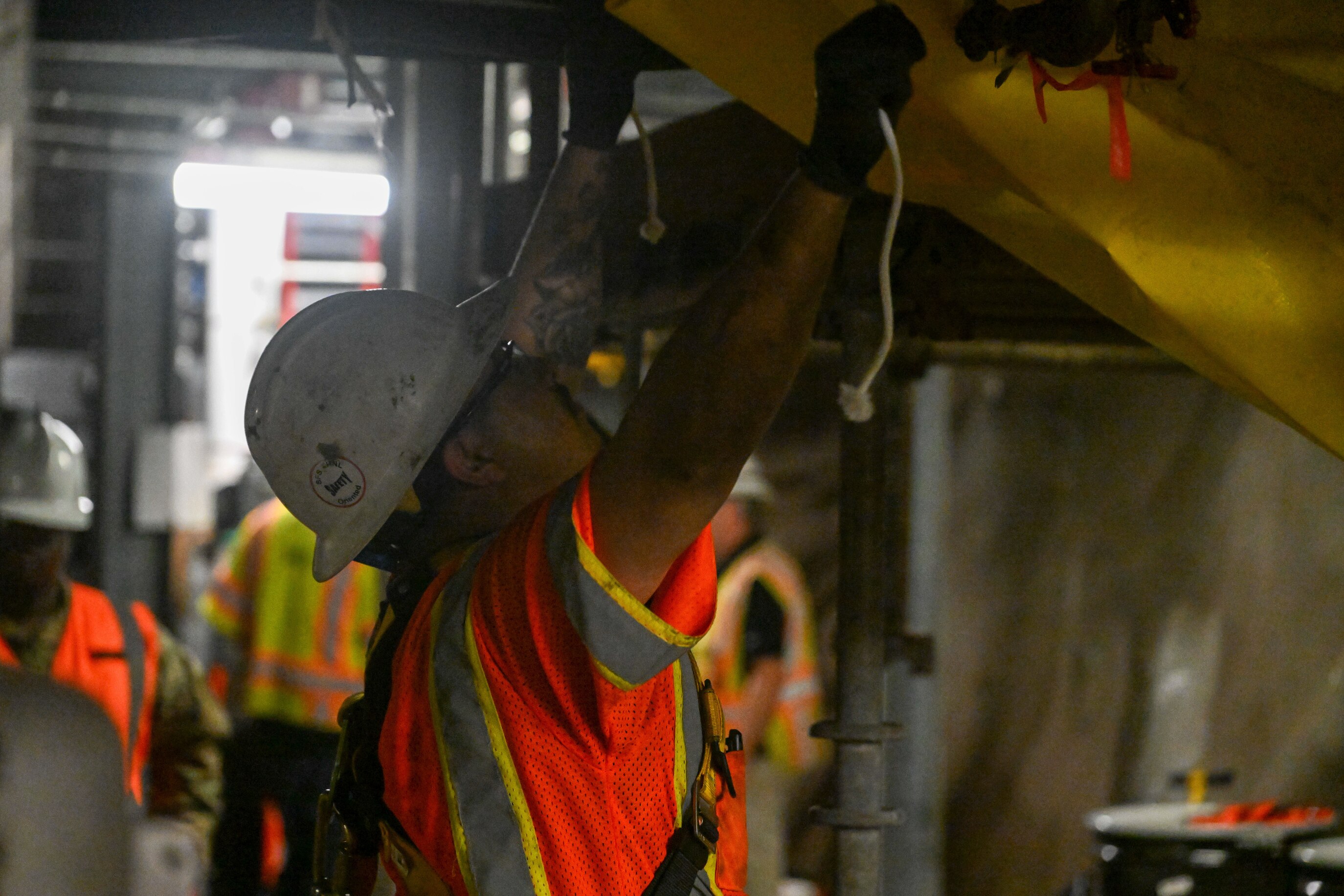 A member in support of Joint Task Force-Red Hill (JTF-RH) prepares a tarp as a safety precaution for residual fuel removal at the Red Hill Bulk Fuel Storage Facility (RHBFSF) Jan. 22, 2024, Halawa, Hawaii. JTF-RH is now in Defueling Phase 5.B where personnel are focused on removing residual fuel and transitioning with the NCTF-RH. The transition will focus on NCTF-RH learning JTF-RH’s processes and procedures for safety, security, and engagement to ensure continuity of operations. During this phase, JTF-RH retains command and control over the RHBFSF Joint Operational Area (JOA) and will synchronize actions to rebuild trust with Federal, State, and local stakeholders. (DoD photo by U.S. Army Sgt. ZaBarr Jones)