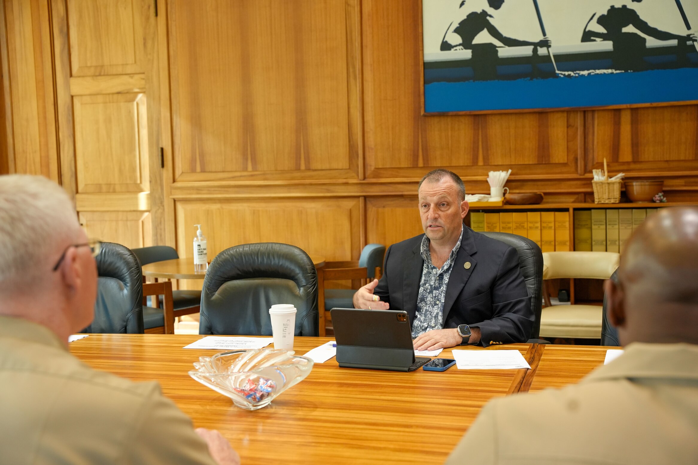 Hawaii State Governor Josh Green speaks with Joint Task Force-Red Hill (JTF-RH) Commander, U.S. Navy Vice Adm. John Wade, and Navy Closure Task Force - Red Hill (NCTF-RH) Commander, Rear Adm. Steve Barnett, during the Governor’s Water Committee Feb. 02, 2024, at the Hawaii State Capitol, Honolulu, Hawaii. JTF-RH is now in Defueling Phase 5.B where personnel are focused on removing residual fuel and transitioning with the NCTF-RH. The transition will focus on NCTF-RH learning JTF-RH’s processes and procedures for safety, security, and engagement to ensure continuity of operations. During this phase, JTF-RH retains command and control over the RHBFSF Joint Operational Area (JOA) and will synchronize actions to rebuild trust with Federal, State and local stakeholders. (DoD photo by U.S. Marine Corps Cpl. Gabrielle Zagorski)