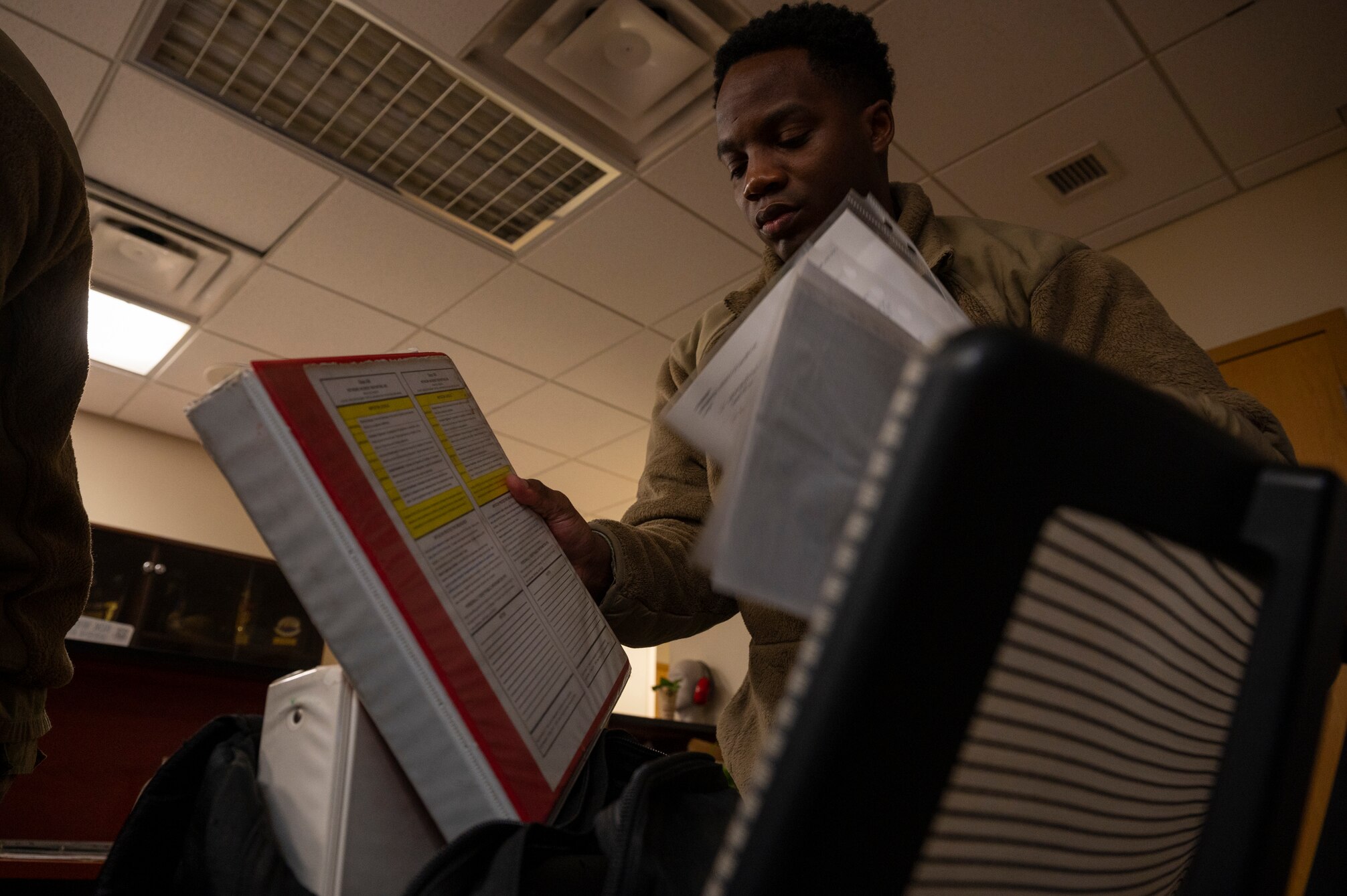 U.S. Air Force Staff Sgt. Jabari Freeman, 51st Operations Support Squadron weather technician, packs a bag to relocate to an alternate duty location during Beverly Midnight 24-1 at Osan Air Base, Republic of Korea, Jan. 29, 2024. BM24-1 is a routine training event that tests the military capabilities across the peninsula, allowing combined and joint training at both the operational and tactical levels. (U.S. Air Force photo by Senior Airman Kaitlin Castillo)