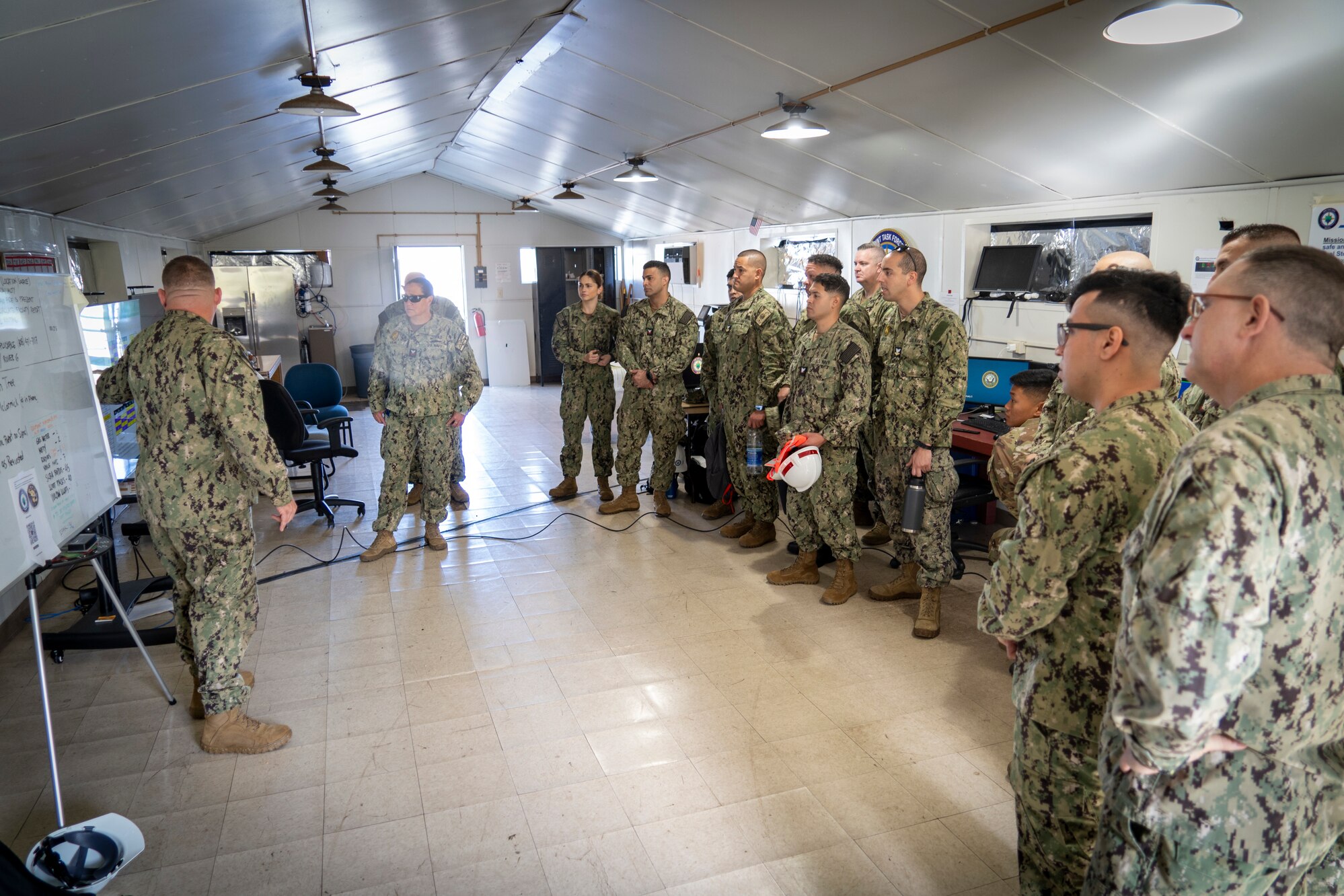 U.S. Navy personnel receive a situational brief of the Red Hill Bulk Fuel Storage Facility (RHBFSF) Feb. 5, 2024, Joint Base Pearl Harbor - Hickam, Hawaii. The Navy personnel were training to man access control points at the RHBFSF as responsibility of the facility transitions from Joint Task Force - Red Hill (JTF-RH) to Navy Closure Task Force - Red Hill (NCTF-RH). JTF-RH is now in Defueling Phase 5.B where personnel are focused on removing residual fuel and transitioning with the NCTF-RH. The transition will focus on NCTF-RH learning JTF-RH’s processes and procedures for safety, security, and engagement to ensure continuity of operations. During this phase, JTF-RH retains command and control over the RHBFSF Joint Operational Area (JOA) and will synchronize actions to rebuild trust with Federal, State and local stakeholders. (DoD photo by U.S. Air Force Staff Sgt. Orlando Corpuz)
