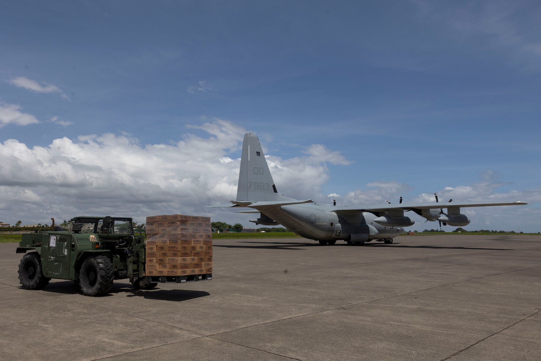 A Light Capacity Rough Terrain Forklift with Marine Wing Support Squadron 172, 1st Marine Aircraft Wing, moves an offloaded pallet of Department of Social Welfare and Development family food packs from Villamor Air Base at Davao International Airport, Davao City, Philippines, Feb. 12, 2024. At the request of the Government of the Philippines, the U.S. Marines of III Marine Expeditionary Force are supporting the U.S. Agency for International Development in providing foreign humanitarian assistance to the ongoing disaster relief mission in Mindanao. The forward presence and ready posture of III MEF assets in the region facilitated rapid and effective response to crisis, demonstrating the U.S.’s commitment to Allies and partners during times of need. (U.S. Marine Corps photo by Sgt. Savannah Mesimer)