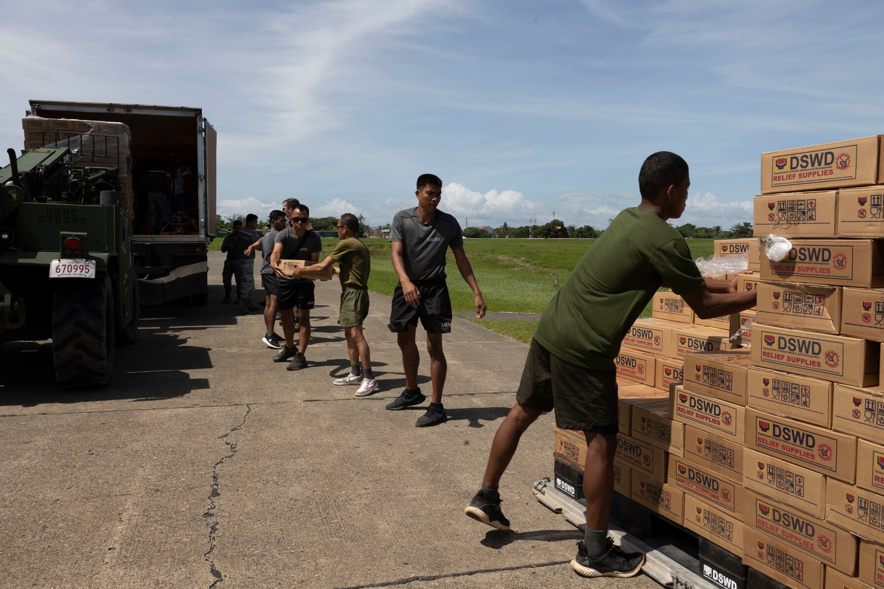 U.S. Marines with Marine Aerial Refueler Transport Squadron 152, 1st Marine Aircraft Wing, alongside Philippine Air Force service members load Department of Social Welfare and Development family food packs onto a truck for transportation at Davao International Airport, Davao City, Philippines, Feb. 12, 2024. At the request of the Government of the Philippines, the U.S. Marines of III Marine Expeditionary Force are supporting the U.S. Agency for International Development in providing foreign humanitarian assistance to the ongoing disaster relief mission in Mindanao. The forward presence and ready posture of III MEF assets in the region facilitated rapid and effective response to crisis, demonstrating the U.S.’s commitment to Allies and partners during times of need. (U.S. Marine Corps photo by Sgt. Savannah Mesimer)