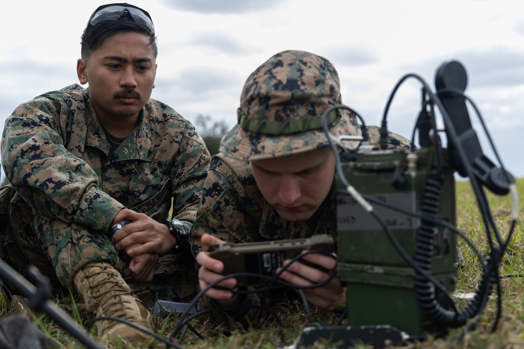 U.S. Marines Lance Cpl. Christian Montemayor, a fire support Marine, left, and Sgt. John Philips a transmissions system operator, right, both with 5th Air Naval Gunfire Liaison Company, III Marine Expeditionary Force Information Group, conduct a communications check during a field exercise, Rapid Tanto at Ie Shima, Okinawa, Japan, Feb. 6, 2024. The radio allowed transmission of data to higher headquarters. Using off-the-shelf radars and low-signature equipment, 5th ANGLICO and 3rd Intelligence Battalion demonstrated proficiency in planning, coordination, and execution of dynamic targeting capable of supporting maritime campaigns in an increasingly contested Indo-Pacific. Philips is a native of Gaffney SC, and Montemayor is a native of San Diego. (U.S. Marine Corps photo by Cpl. William Wallace)