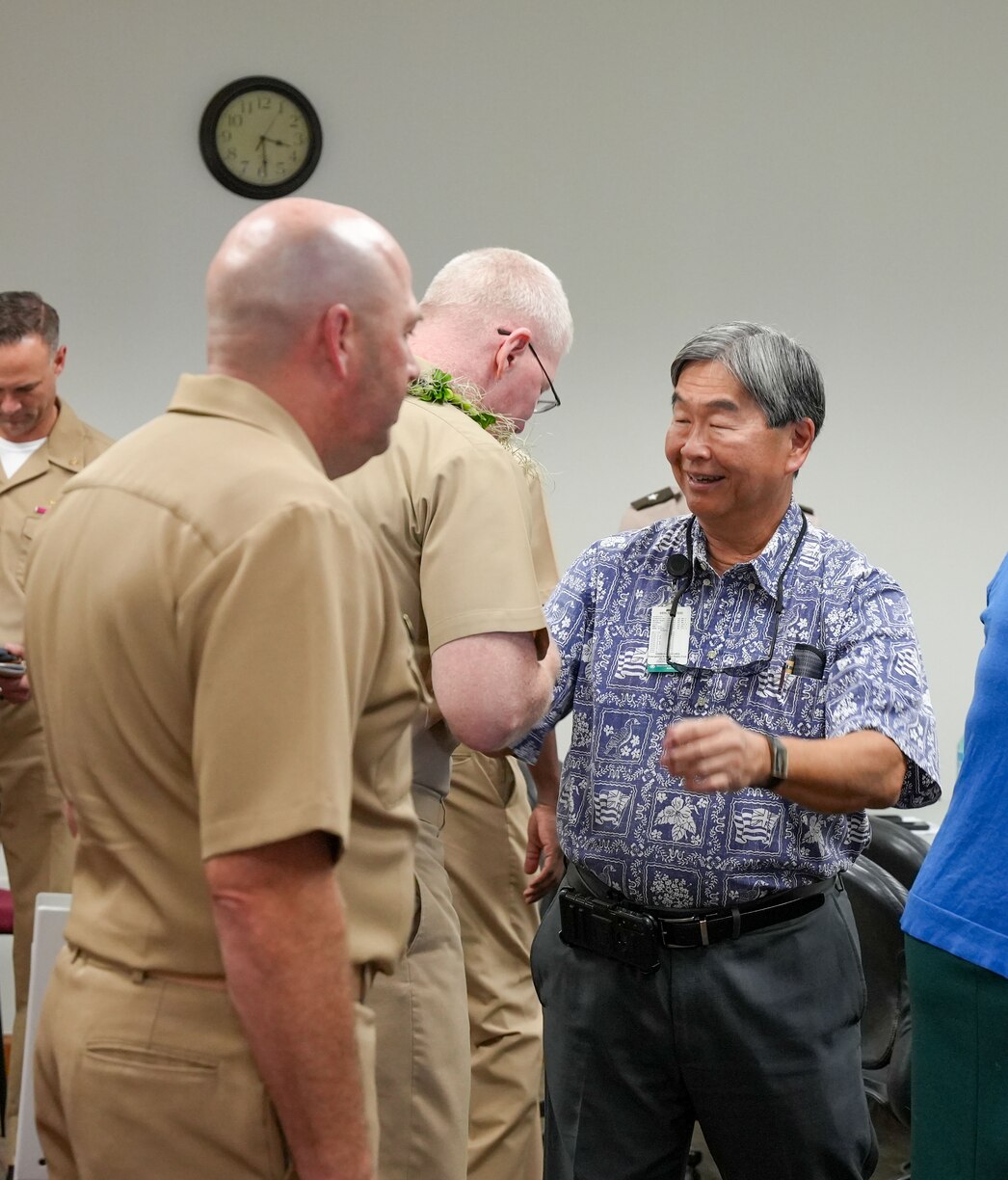 Joint Task Force-Red Hill (JTF-RH) Commander, U.S. Navy Vice Adm. John Wade receives a traditional Hawaii flower lei from Manager and Chief engineer of the Board of Water Supply, Ernest Y. W. Lau at the Defueling Information Sharing Forum, Feb. 22, 2024 at the Hawaii State Capitol, Honolulu, Hawaii. The forum brings local community members, elected representatives and other stakeholders together with JTF-RH leadership to discuss the defueling of the Red Hill Bulk Fuel Storage Facility (RHBFSF) and to provide critical community feedback. JTF-RH is now in Defueling Phase 5.B where personnel are focused on removing residual fuel and transitioning with the NCTF-RH. The transition will focus on NCTF-RH learning JTF-RH’s processes and procedures for safety, security, and engagement to ensure continuity of operations. During this phase, JTF-RH retains command and control over the RHBFSF Joint Operational Area and will synchronize actions to rebuild trust with Federal, State and local stakeholders. (DoD photo by U.S. Marine Corps Cpl. Gabrielle Zagorski)