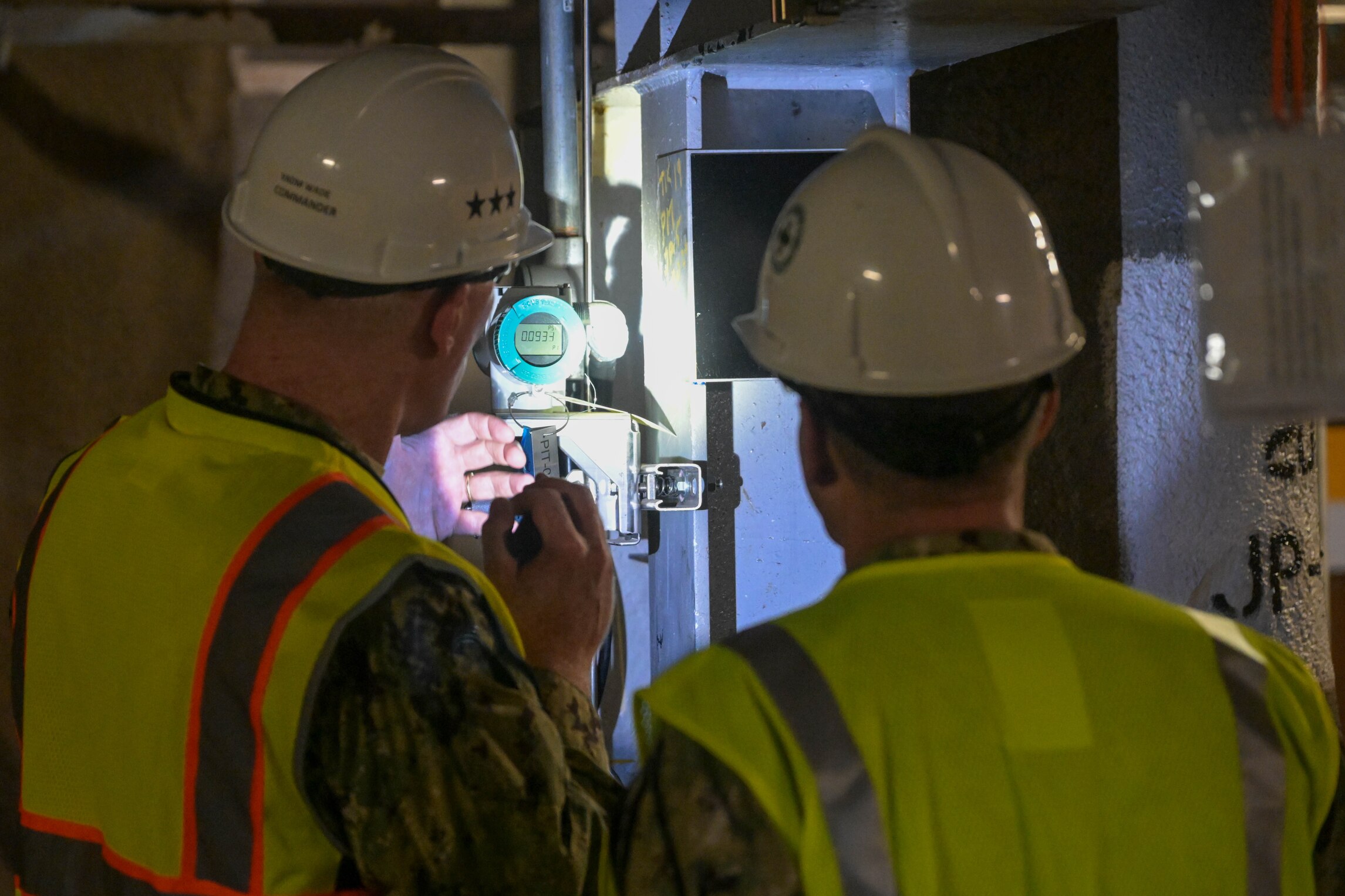 Joint Task Force-Red Hill (JTF-RH) Commander, U.S. Navy Vice Adm. John Wade, views a pressure indicator with Vice Adm. Jeffrey Jablon, Deputy Chief of Naval Operations for Installations and Logistics, during a visit to the Red Hill Bulk Fuel Storage Facility (RHBFSF), Halawa, Hawaii, Feb. 22, 2024. JTF-RH is now in Defueling Phase 5.B where personnel are focused on removing residual fuel and transitioning with the Navy Closure Task Force - Red Hill (NCTF-RH). The transition will focus on NCTF-RH learning JTF-RH’s processes and procedures for safety, security, and engagement to ensure continuity of operations. During this phase, JTF-RH retains command and control over the RHBFSF Joint Operational Area (JOA) and will synchronize actions to rebuild trust with Federal, State and local stakeholders. (DoD photo by U.S. Army Sgt. ZaBarr Jones)