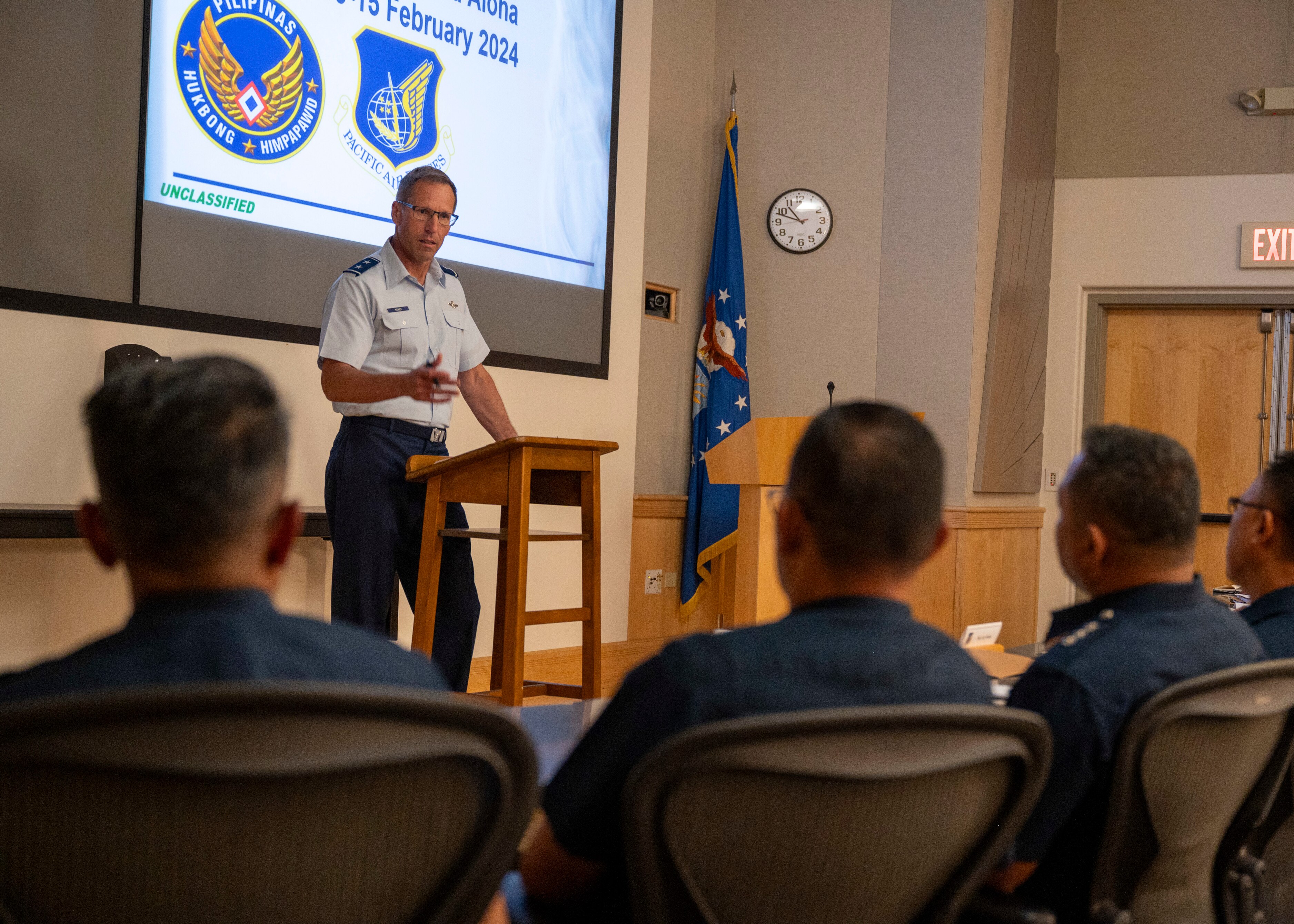 U.S. Air Force Maj. Gen. Mark Weber, Air National Guard Assistant to the Pacific Air Forces Commander, provides opening remarks during an Airmen-to-Airmen Talk hosted by Pacific Air Forces at Joint Base Pearl Harbor-Hickam, Hawaii, Feb. 13, 2024. Events like A2ATs enable PACAF personnel to expand foreign relations with Allies and partners across the Indo-Pacific region. (U.S. Air Force photo by Tech. Sgt. Jimmie D. Pike)