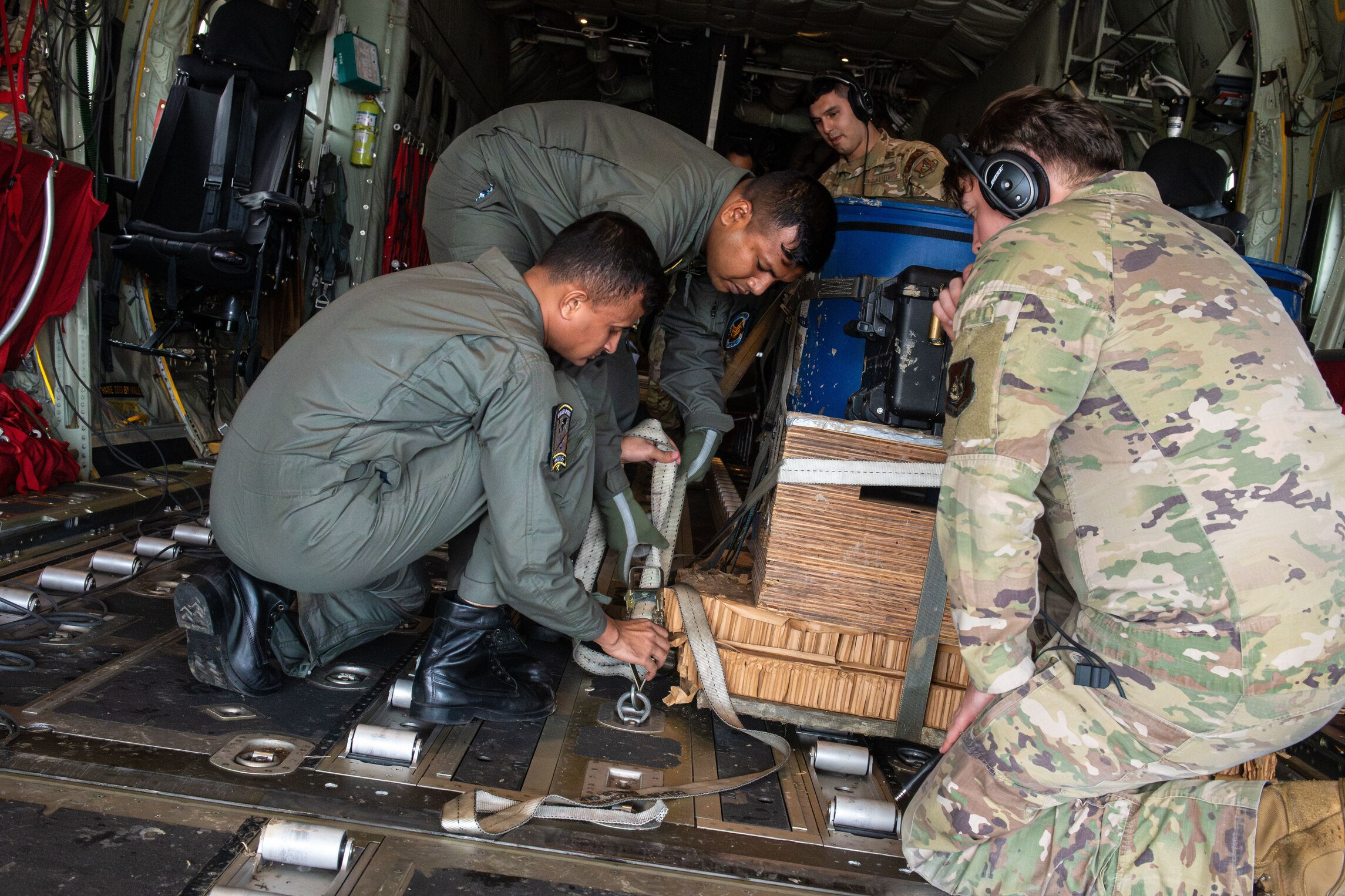Bangladesh Air Force Sgts. Akbar Hosen and Nazmus Sakib secure cargo in the back of a U.S. Air Force C-130J Super Hercules after retrieving airdrop and personnel during Cope South 2024, Feb. 22, 2024, at Bangladesh Air Force Bangabandhu Cantonment, Bangladesh. CS24, a Pacific Air Forces-sponsored bilateral tactical airlift exercise, provides airlift training for U.S. and Bangladeshi aircrews in aircraft generation and recovery, low-level navigation, tactical airdrop and air-land missions. (U.S. Air Force photo by Staff Sgt. Tristan Truesdell)