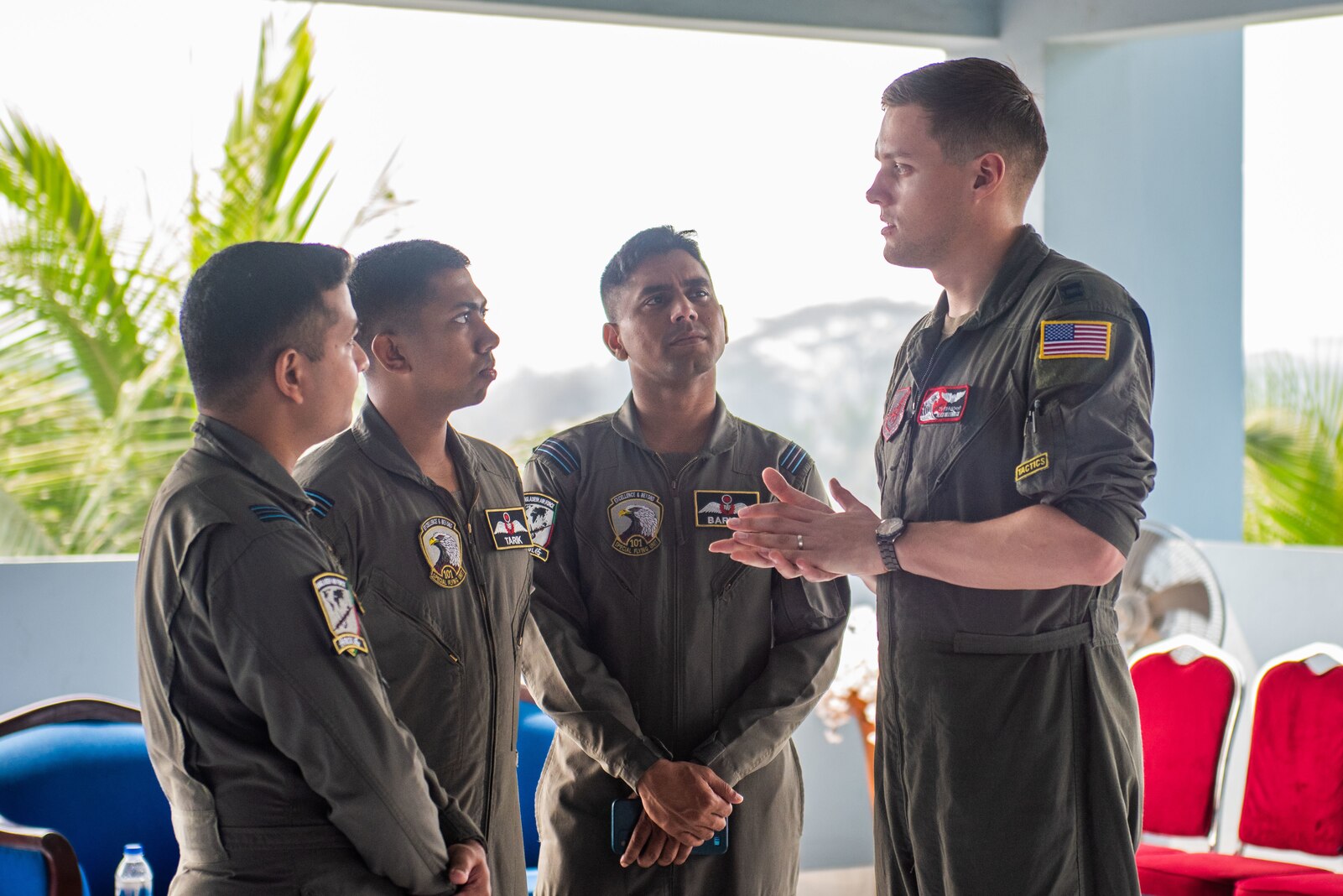 U.S. Air Force Capt. Joshua Dillenbeck, 36th Expeditionary Airlift Squadron pilot, meets with Bangladesh Air Force officers during a social hour after the opening ceremony for Cope South 2024, Feb. 19, 2024, at BAF Bangabandhu Cantonment, Bangladesh. When participating in routine exercises with military forces of regional partners such as Bangladesh, the U.S. upholds commitment to peace and stability within the Indo-Pacific region. CS24 promotes building strong relationships with regional partners and enhancing interoperability by training side-by-side. (U.S. Air Force photo by Staff Sgt. Tristan Truesdell)