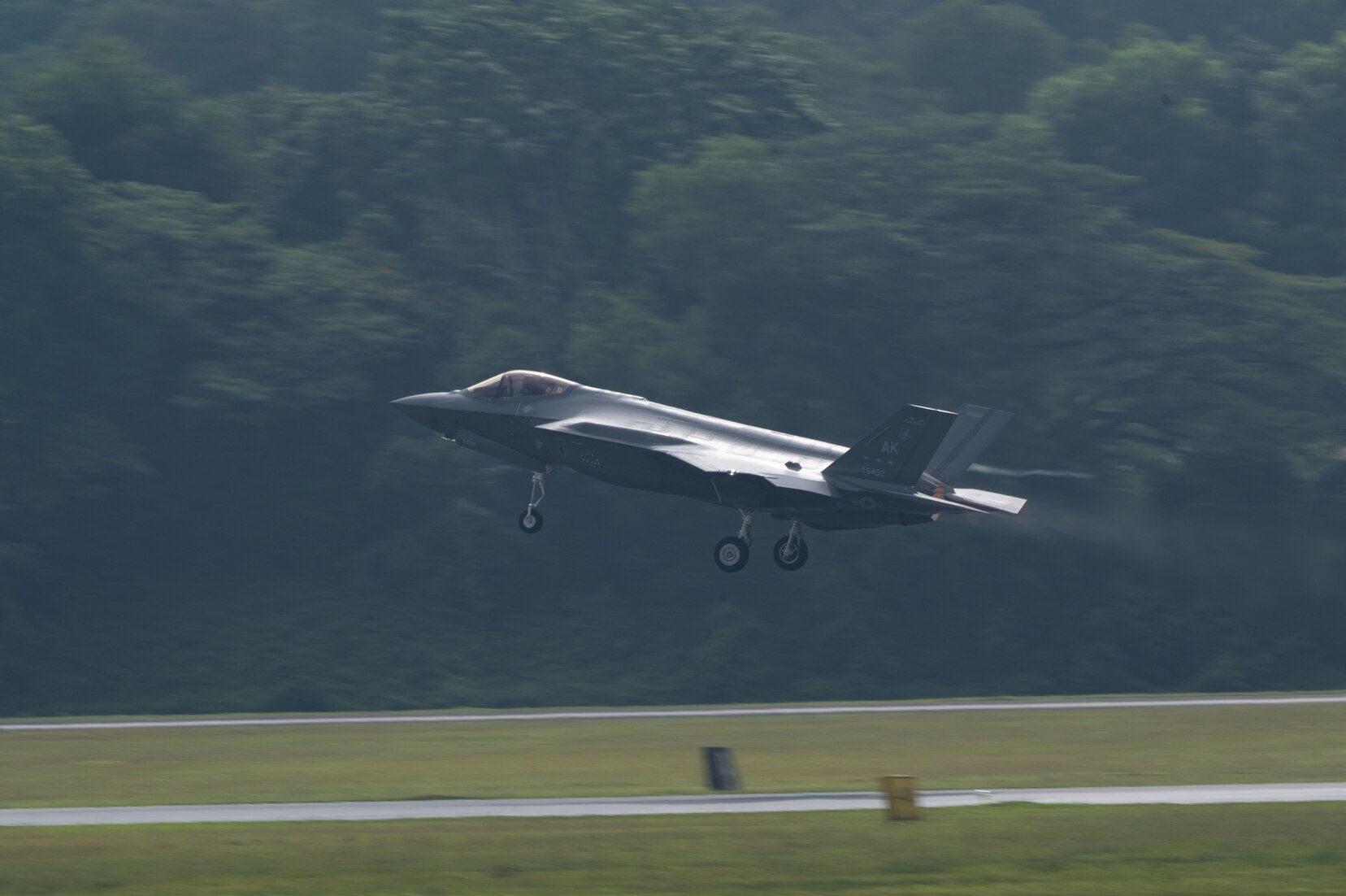 A U.S. Air Force F-35 Lightning II assigned to the 356th Fighter Squadron, Eielson Air Force Base Alaska, departs Paya Lebar Air Base, Singapore, to participate in bilateral training with the Republic of Singapore Air Force March 5, 2024. The bilateral training with the RSAF is part of a Dynamic Force Employment and provides joint force commanders the flexible capability to increase the range and capabilities of U.S. Air Force units in the Pacific region at the time and location of need. (U.S. Air Force photo by Tech. Sgt. Eric Summers Jr.)