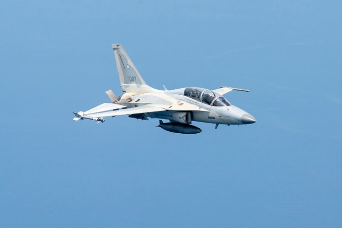 A Philippine Air Force FA-50 executes a bilateral training mission during exercise Cope Thunder 23-2 over the South China Sea, July 10, 2023. Through bilateral training, the U.S. and Philippine Air Forces work together to promote interoperability, thus furthering our investments and strengthening our relationships. (U.S. Air National Guard photo by Master Sgt. Mysti Bicoy)