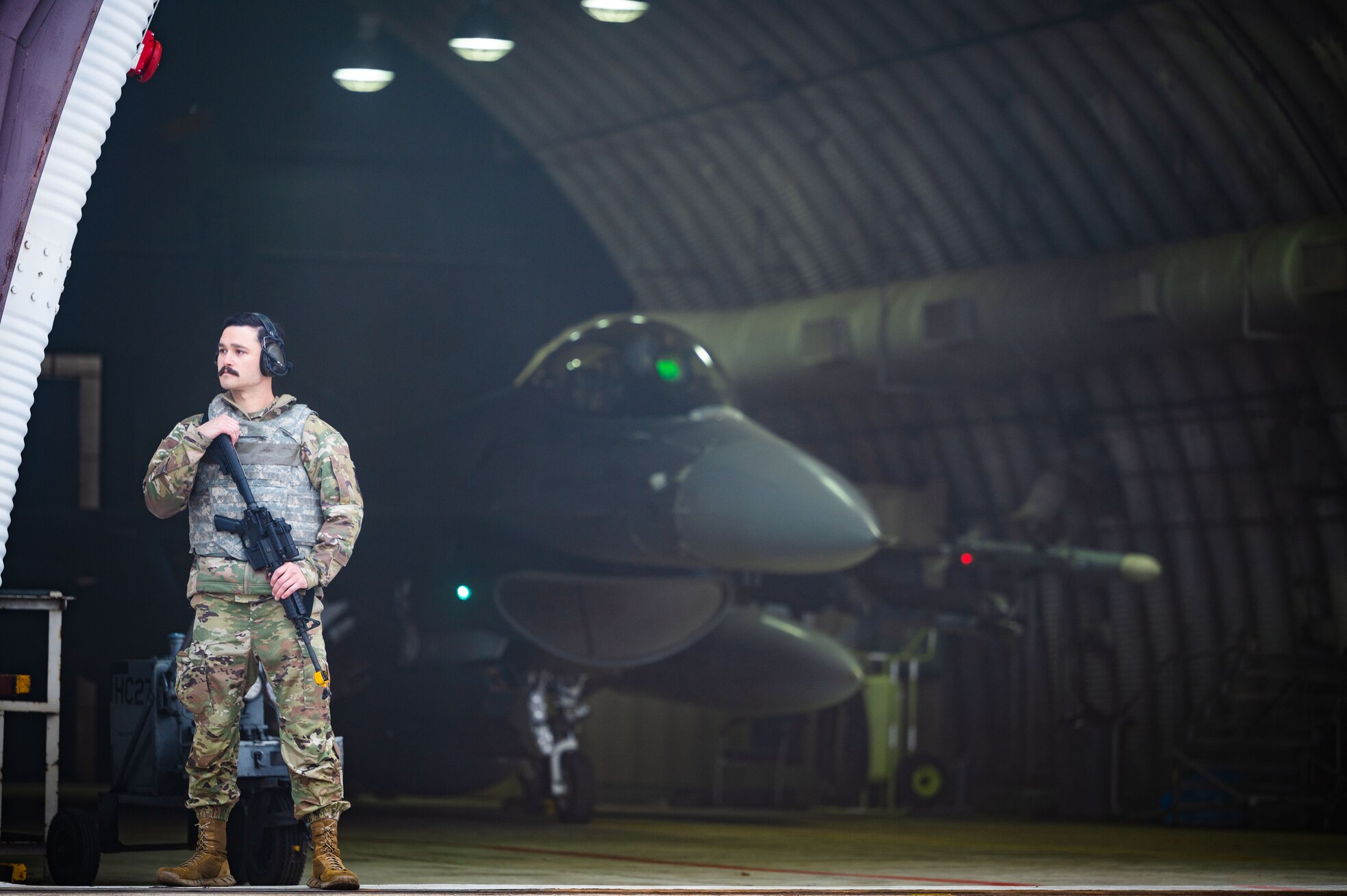 Staff Sgt. Justin Aaron, 80th Fighter Generation Squadron dedicated crew chief, provides armed guard surveillance during an F-16 Fighting Falcon launch during Beverly Sentinel 24-1 at Kunsan Air Base, Republic of Korea, March 27, 2024. Airmen from the 35th and 80th FGS exercised general arming procedures to provide security over vital infrastructure and equipment while preparing F-16s for routine flying operations. (U.S. Air Force photo by Senior Airman Karla Parra)