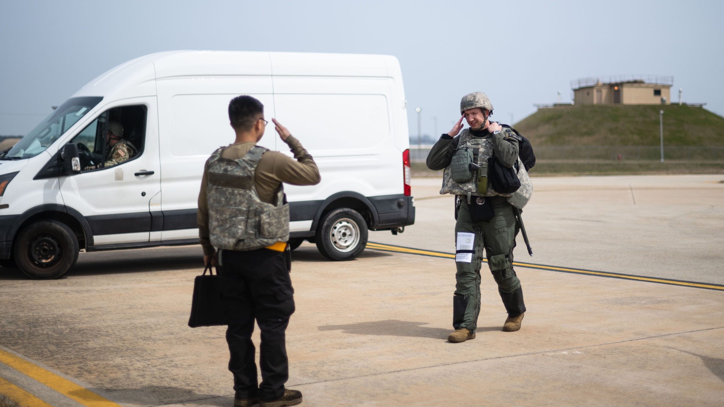 Airman 1st Class Gia-Bao Do, left, 80th Fighter Generation Squadron assistant crew chief, salutes Lt. Col. Brandon July, 80th Fighter Squadron commander, before a training sortie as part of Beverly Sentinel 24-1 at Kunsan Air Base, Republic of Korea, March 27, 2024. General arming procedures during Beverly Sentinel 24-1 tested Airmen’s ability to defend their position and assets while completing their daily mission requirements. (U.S. Air Force photo by Senior Airman Karla Parra)