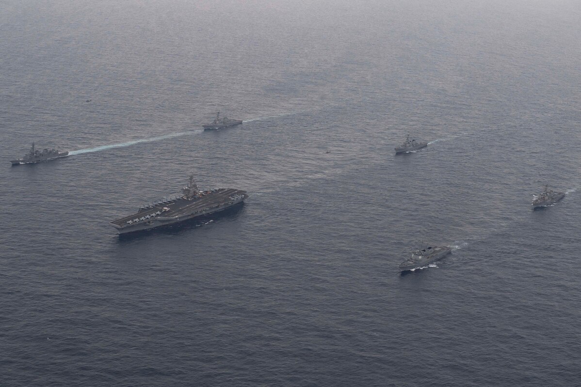 AT SEA (April 11, 2024) Ships assigned to the Theodore Roosevelt Carrier Strike Group, Japan Maritime Self-Defense Force and Republic of Korea Navy sail in formation during a trilateral exercise, April 11, 2024. This trilateral exercise allowed maritime forces from Japan, the Republic of Korea, and U.S. to train together to enhance coordination on maritime domain awareness and other shared security interests. The Theodore Roosevelt Carrier Strike Group is deployed to the U.S. 7th Fleet area of operations in support of a free and open Indo-Pacific. (U.S. Navy photo by Mass Communication Specialist 1st Class Tommy Gooley)