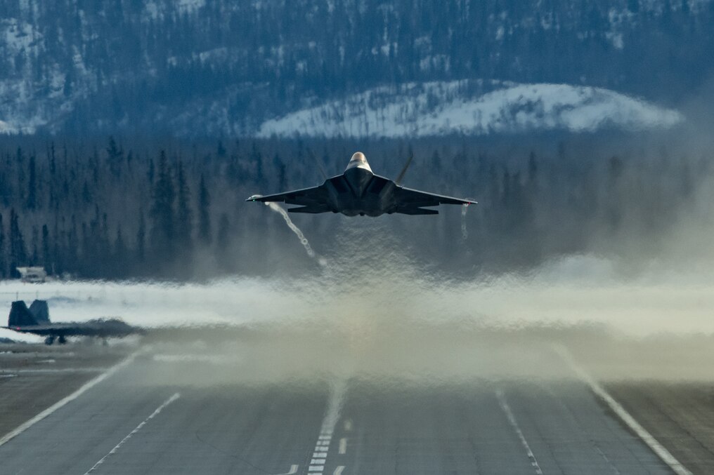 U.S. Air Force F-22 Raptors assigned to the 90th Fighter Squadron take off from Joint Base Elmendorf-Richardson, Alaska, April 7, 2024, for Agile Reaper 24-1. AR 24-1 is an effort from JBER’s 3rd Air Expeditionary Wing to exercise Agile Combat Employment. The exercise will use combat-representative roles and processes to deliberately target all participants as a training audience and stress the force’s capability to generate combat air power across the Indo-Pacific region. (U.S. Air Force photo by Senior Airman Patrick Sullivan)