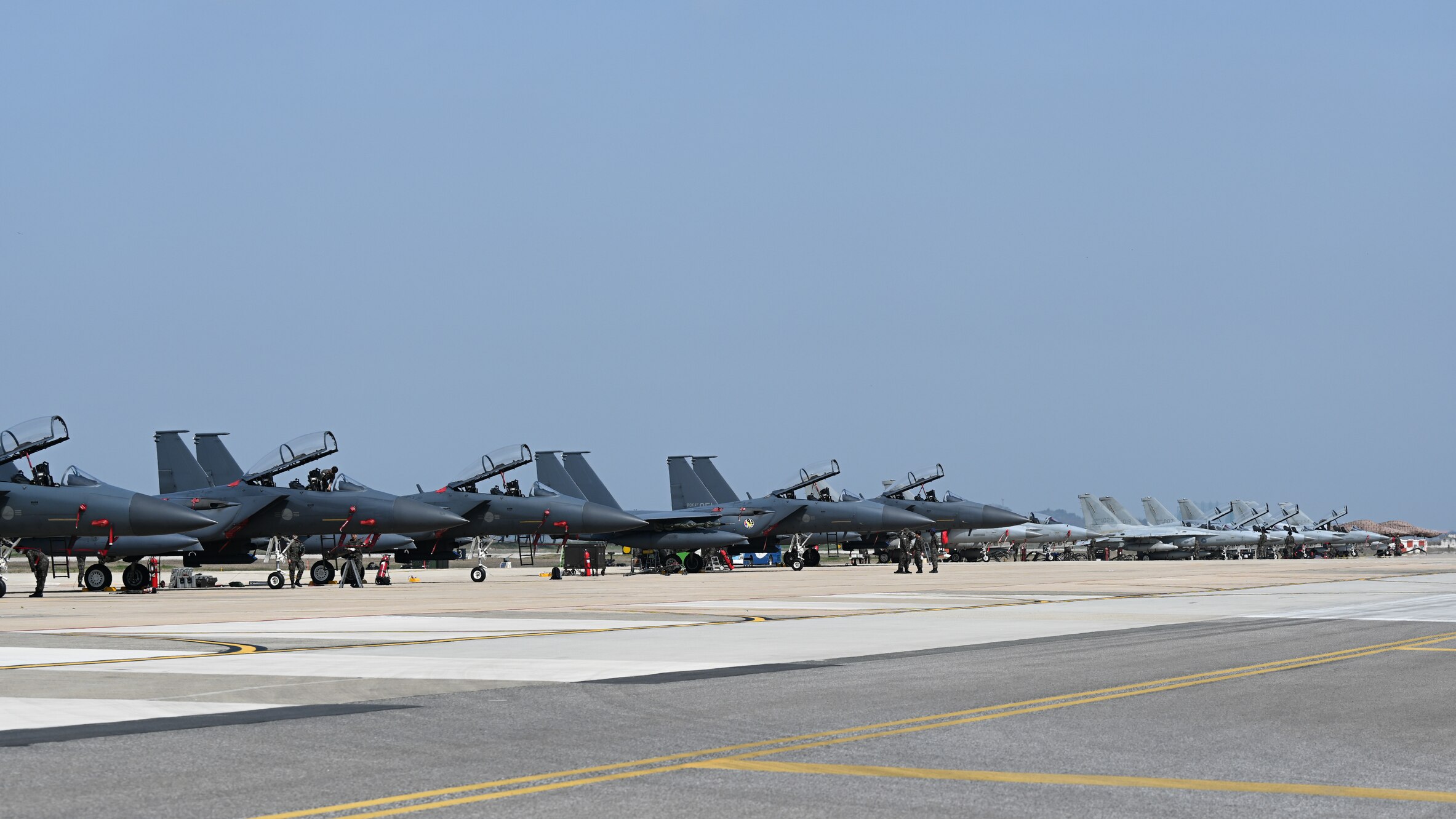 Republic of Korea Air Force F-15K Slam Eagles and FA-50 Golden Eagles parked on the airfield at Kunsan Air Base, ROK, April 12, 2024. ROKAF follow-on forces arrived from across the country to participate in Korea Flying Training 2024. (U.S. Air Force photo by Staff Sgt. Nicholas Ross)