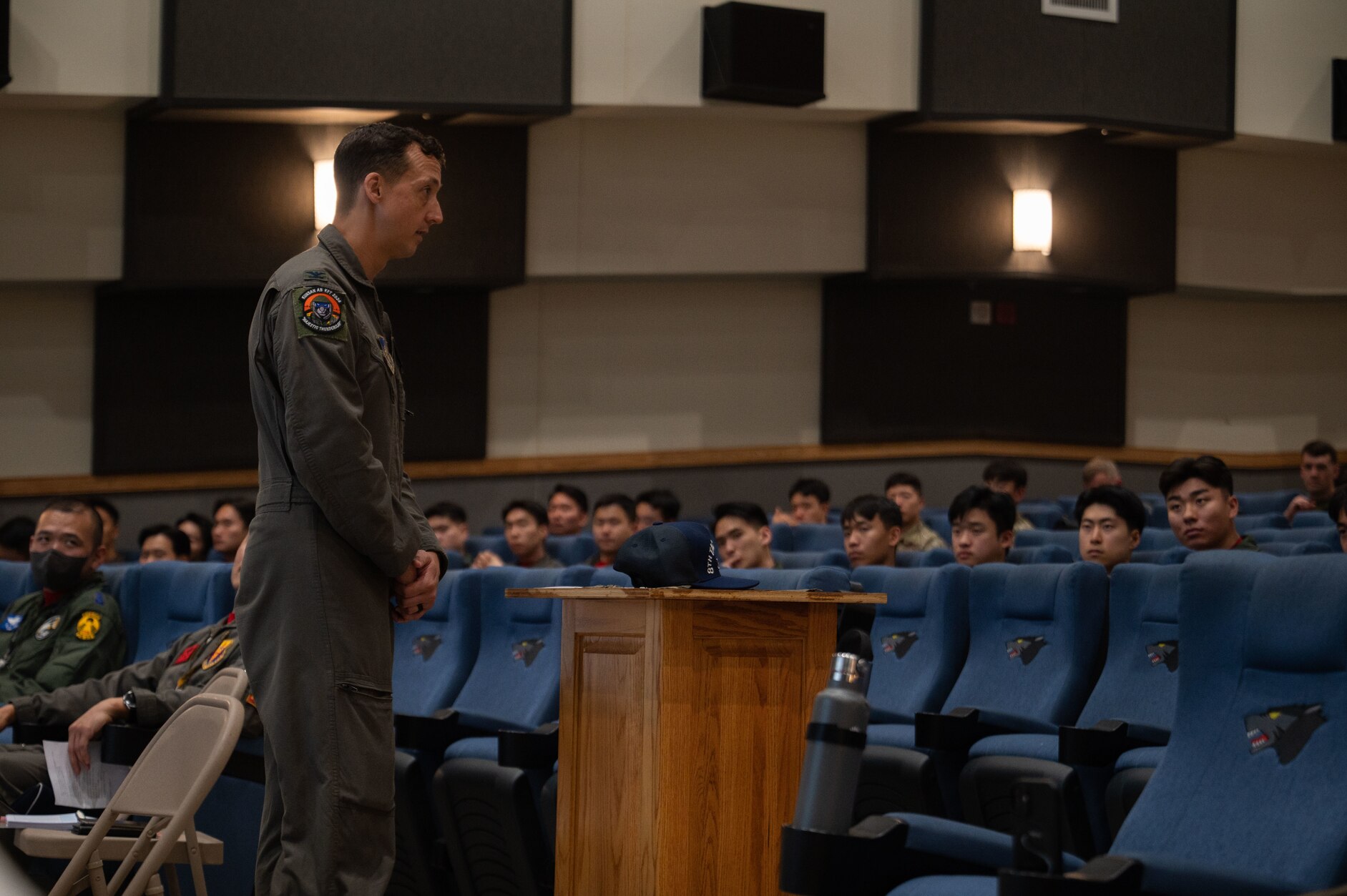 U.S. Air Force Col. Michael G. McCarthy, 8th Operation Group commander, delivers opening remarks at a welcoming briefing before the start of Korea Flying Training 24 at Kunsan Air Base, Republic of Korea, April 12, 2024. KFT 24 is an annual large-scale U.S. and ROK Air Force integration flying exercise designed to improve interoperability of combined and joint airpower execution, face-to-face combined mission planning, flying execution, and effective debriefing to train mission commanders and aircrew to operate and succeed in robust, complex scenarios. (U.S. Air Force photo by Tech. Sgt. Emili Koonce)