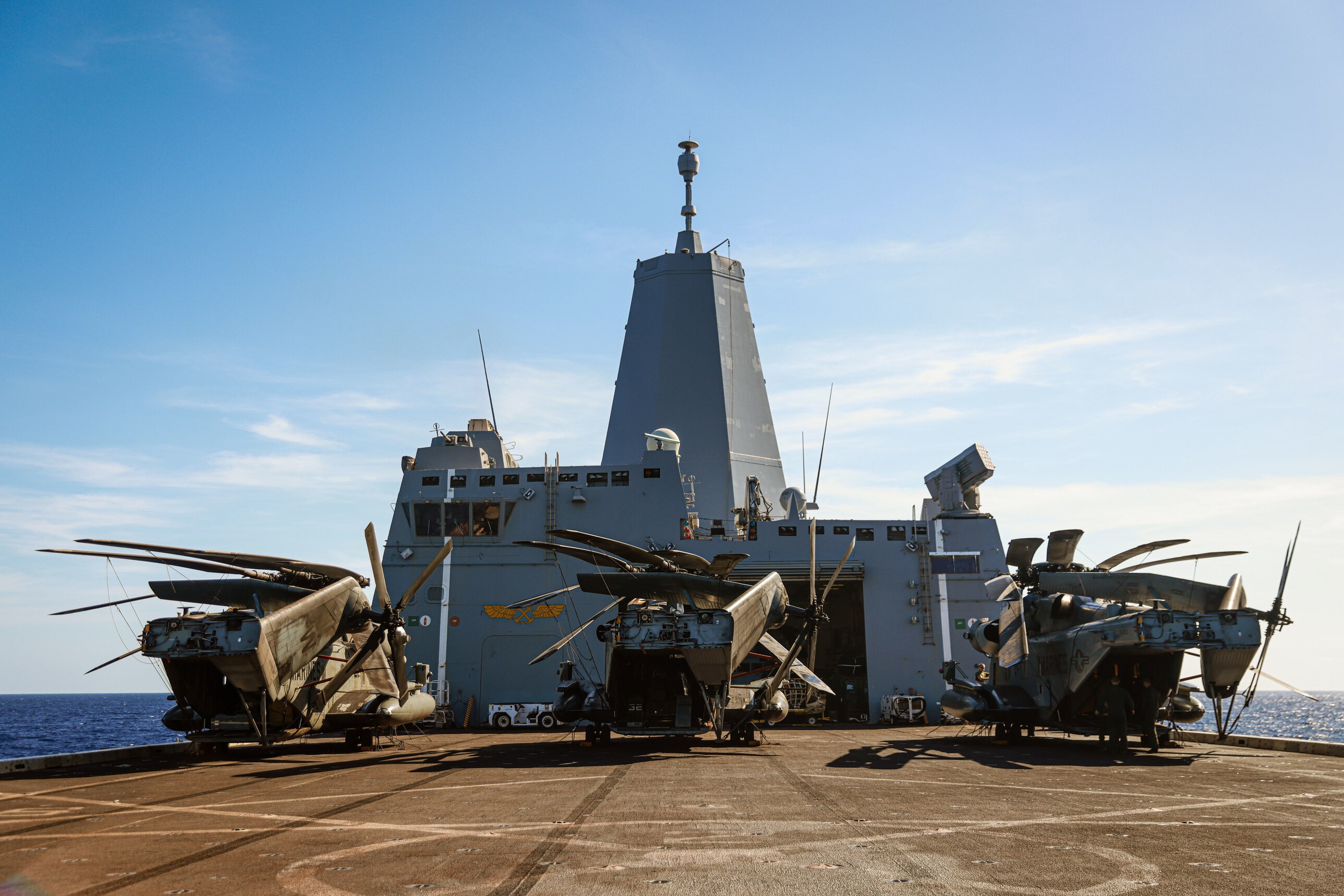 U.S. Marines assigned to Marine Medium Tiltrotor Squadron (VMM) 165 (Reinforced), 15th Marine Expeditionary Unit, prepare CH-53E Super Stallions attached to VMM-165 (Rein.), 15th MEU, for flight operations aboard the amphibious transport dock USS Somerset (LPD 25) in the South China Sea April 11, 2024. Somerset and embarked elements of the 15th MEU are conducting routine operations in the U.S. 7th Fleet area of operations. 7th Fleet is the U.S. Navy's largest forward-deployed numbered fleet, and routinely interacts and operates with allies and partners in preserving a free and open Indo-Pacific region. (U.S. Marine Corps photo by Cpl. Aidan Hekker)