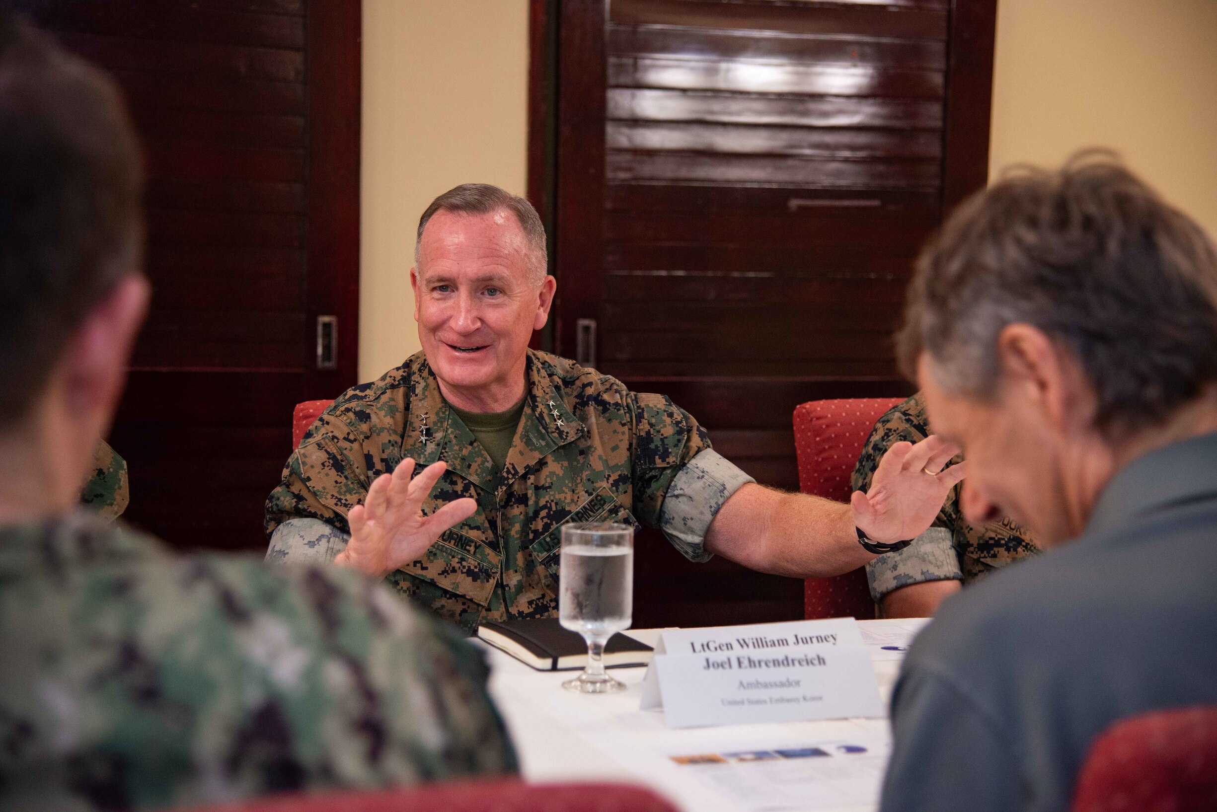 U.S. Marine Corps Lt. Gen. William M. Jurney, commander, U.S. Marine Corps Forces, Pacific, speaks with U.S. Ambassador for the Republic of Palau Joel Ehrendreich and members of the U.S. Embassy during a country team brief at the Palau Royal Resort, Apr. 25. Jurney traveled to Palau to meet with local and military leaders to discuss regional defense partnerships and opportunities. Palau is one of the Compact of Free Association states aligned with the United States, which provides defense, funding, and access to social services. (U.S. Navy photo by Mass Communication Specialist 1st Class Samantha Jetzer)