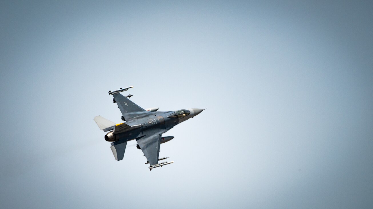 A U.S. Air Force F-16 Fighting Falcon flies overhead after taking off from the flightline at Kunsan Air Base, Republic of Korea, April 19, 2024. Two F-16s and two U.S. Marine Corps F-35B Lightning IIs joined a U.S. Air Force MQ-9 Reaper for a joint close air support training event as part of Korea Flying Training 24, the largest ROK-U.S. combined flying training event held annually on Korean peninsula. The event marked the first time an MQ-9 has conducted live munitions strike training on the Korean peninsula. (U.S. Air Force photo by Staff Sgt. Samuel Earick)