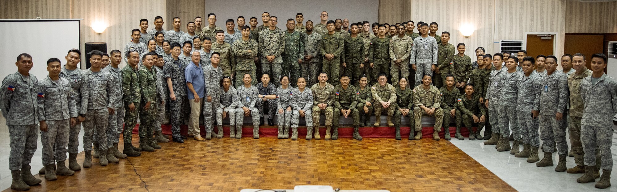 Service members from the U.S. Military, Armed Forces of the Philippines, and Japan Air Self-Defense Force pose for a photo after a week-long Joint Integrated Air And Missile Defense exchange during Exercise Balikatan 24 at Clark Air Base, Philippines, April 25, 2024. BK 24 is an annual exercise between the Armed Forces of the Philippines and the U.S. military designed to strengthen bilateral interoperability, capabilities, trust, and cooperation built over decades of shared experiences. (U.S. Army photo by Maj. Trevor Wild)