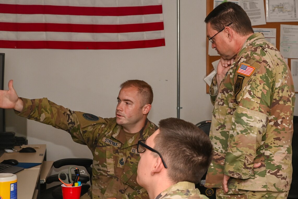 U.S. Space Force Chief of Space Operations Gen. Chance Saltzman, right, speaks with Guardians assigned to 5th Space Warning Squadron, Detachment 3, during a visit to Osan Air Base, Republic of Korea, May 6, 2024. Saltzman met with Guardians at Osan AB, witnessing firsthand the magnitude of the service’s mission in the region and addressing the importance of space superiority in discussions with government and defense officials in Seoul during his visit to the Republic to Korea May 5-7. (U.S. Air Force photo by Master Sgt. Eric Burks) (Portions of this photo have been edited for security reasons.)