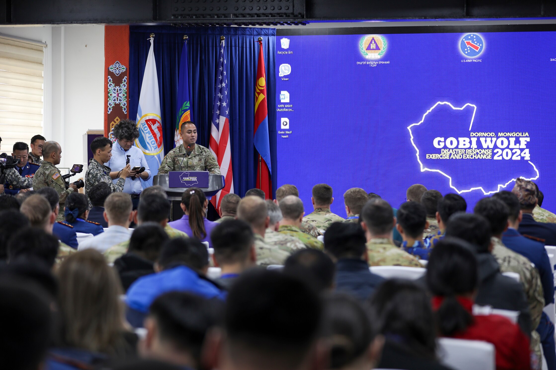 Maj. Marl Pasibe, the Gobi Wolf 2024 exercise director with U.S. Army Pacific, acknowledges all the support staff who have worked tirelessly behind the scenes to make the exercise a resounding success during his closing ceremony speech at the Governor’s Palace in Choibalsan, Mongolia, May 10, 2024. (U.S. Army photo by Capt. Balinda O’Neal)