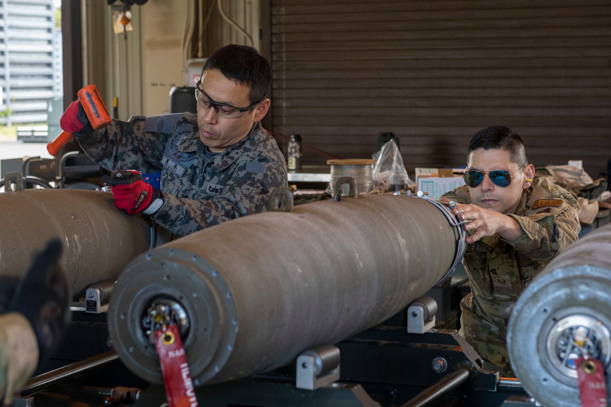 U.S. Air Force and Japan Air Self-Defense Force members work side by side to build munitions during Combat Ammunition Production Exercise at Misawa Air Base, Japan, May 8, 2024. Participating members practiced building bombs in both a home station and an expeditionary environment, showcasing Agile Combat Employment concepts designed to elevate Pacific Air Forces and partners’ adaptability for great power competition throughout the Indo-Pacific region. (U.S. Air Force photo by Airman 1st Class Patrick Boyle)