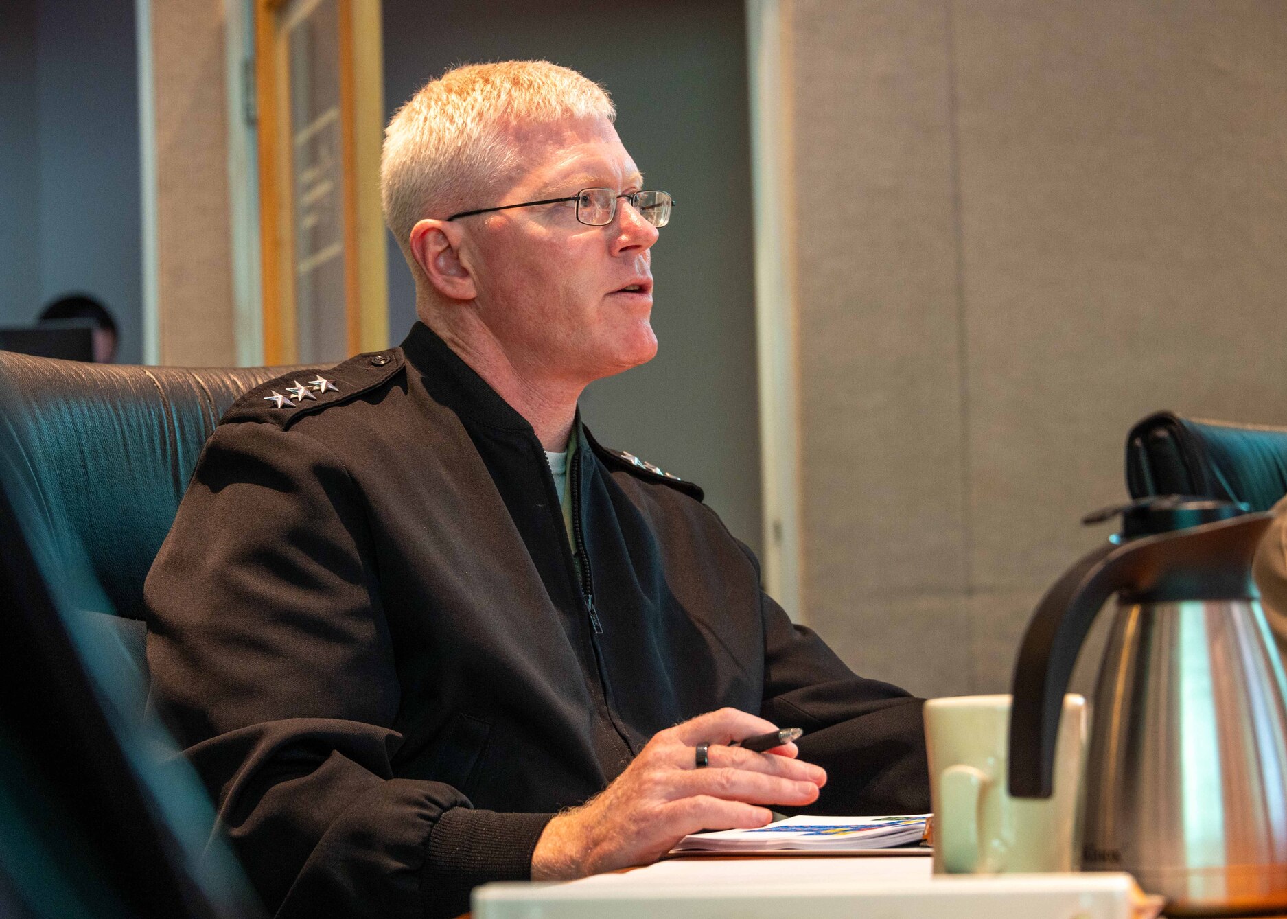 Exercise Rim of the Pacific (RIMPAC) 2024 coordinator Royal Australian Navy Lt. Cmdr. Timothy Gill, right, briefs Commander, U.S. 3rd Fleet (C3F) Vice Adm. John Wade about RIMPAC 2024 at C3F headquarters, June 11, 2024. Twenty-nine nations, 40 surface ships, four submarines, 14 national land forces, more than 171 aircraft and 25,000 personnel are set to participate in RIMPAC in and around the Hawaiian Islands, June 27 to Aug. 1. The world’s largest international maritime exercise, RIMPAC provides a unique training opportunity while fostering and sustaining cooperative relationships among participants critical to ensuring the safety of sea lanes and security on the world’s oceans. RIMPAC 2024 is the 29th exercise in the series that began in 1971. (U.S. Navy photo by Mass Communication Specialist 2nd Sarah C. Eaton)