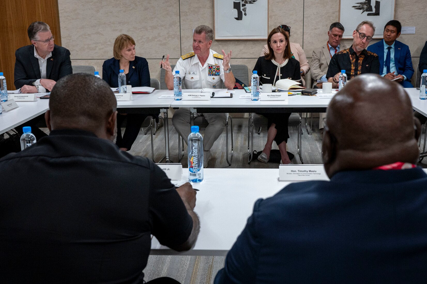 Adm. Samuel J. Paparo, commander of U.S. Indo-Pacific Command (middle), meets with local governors for a roundtable discussion at the U.S. Embassy in Port Moresby, Papua New Guinea on July 15, 2024. Paparo reiterated U.S. commitment to the country through new and sustained initiatives in a whole-of-government approach, leading a interagency delegation that included Dr. Mira Rapp-Hooper, special assistant to the president and National Security Council senior director for East Asia and Oceania; Daniel Krittenbrink, Department of State assistant secretary for the bureau of East Asian and Pacific Affairs; Michael Schiffer, U.S. Agency for International Development assistant administrator of the bureau for Asia; and Anka Lee, deputy assistant secretary of defense for East Asia, joined by U.S. Ambassador to Papua New Guinea, Solomon Islands, and the Republic of Vanuatu Ann Marie Yastishock, to highlight the strategic partnership between the U.S. and Papua New Guinea based on shared history and values. (U.S. Navy photo by Chief Mass Communication Specialist Shannon M. Smith)