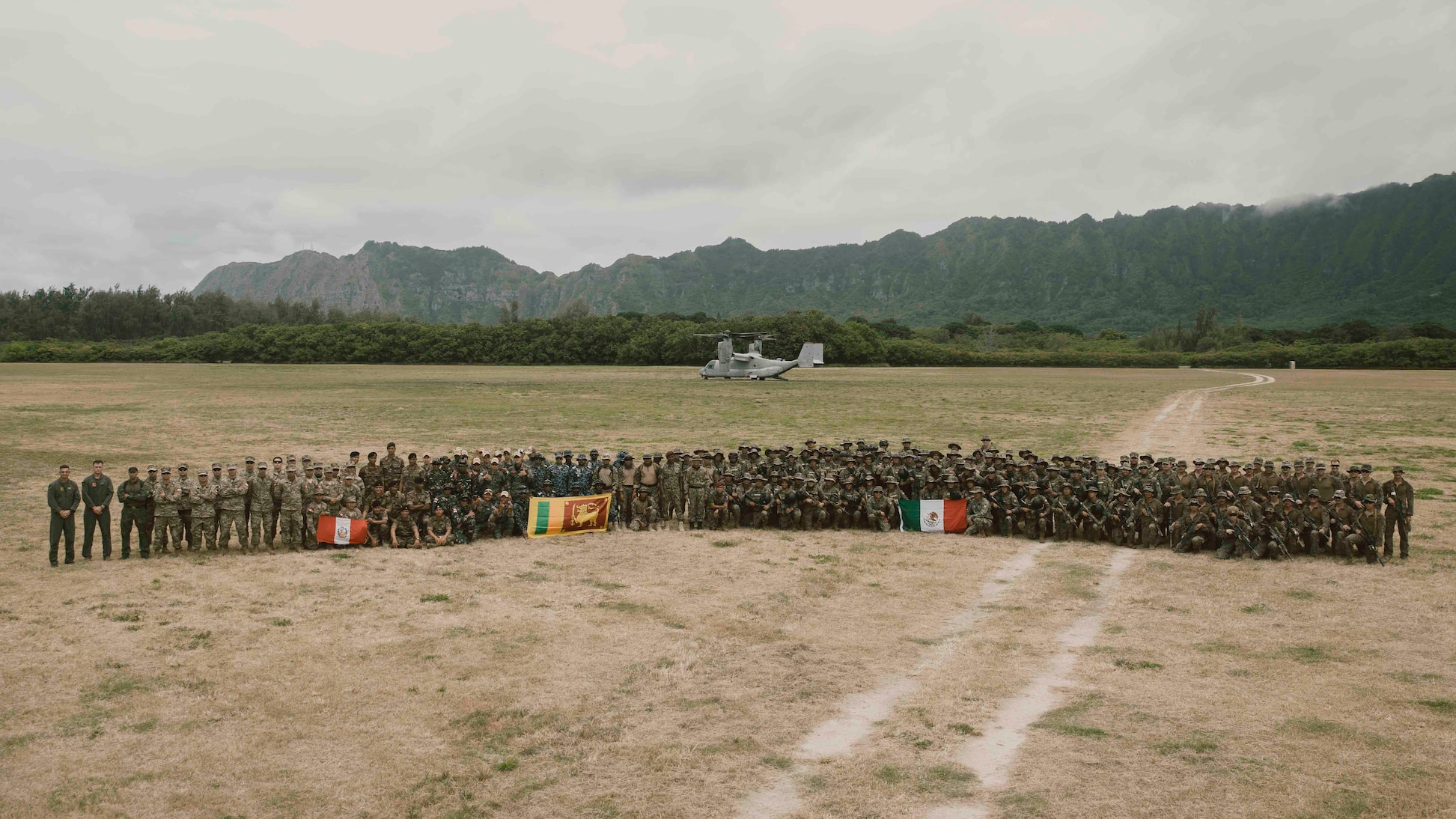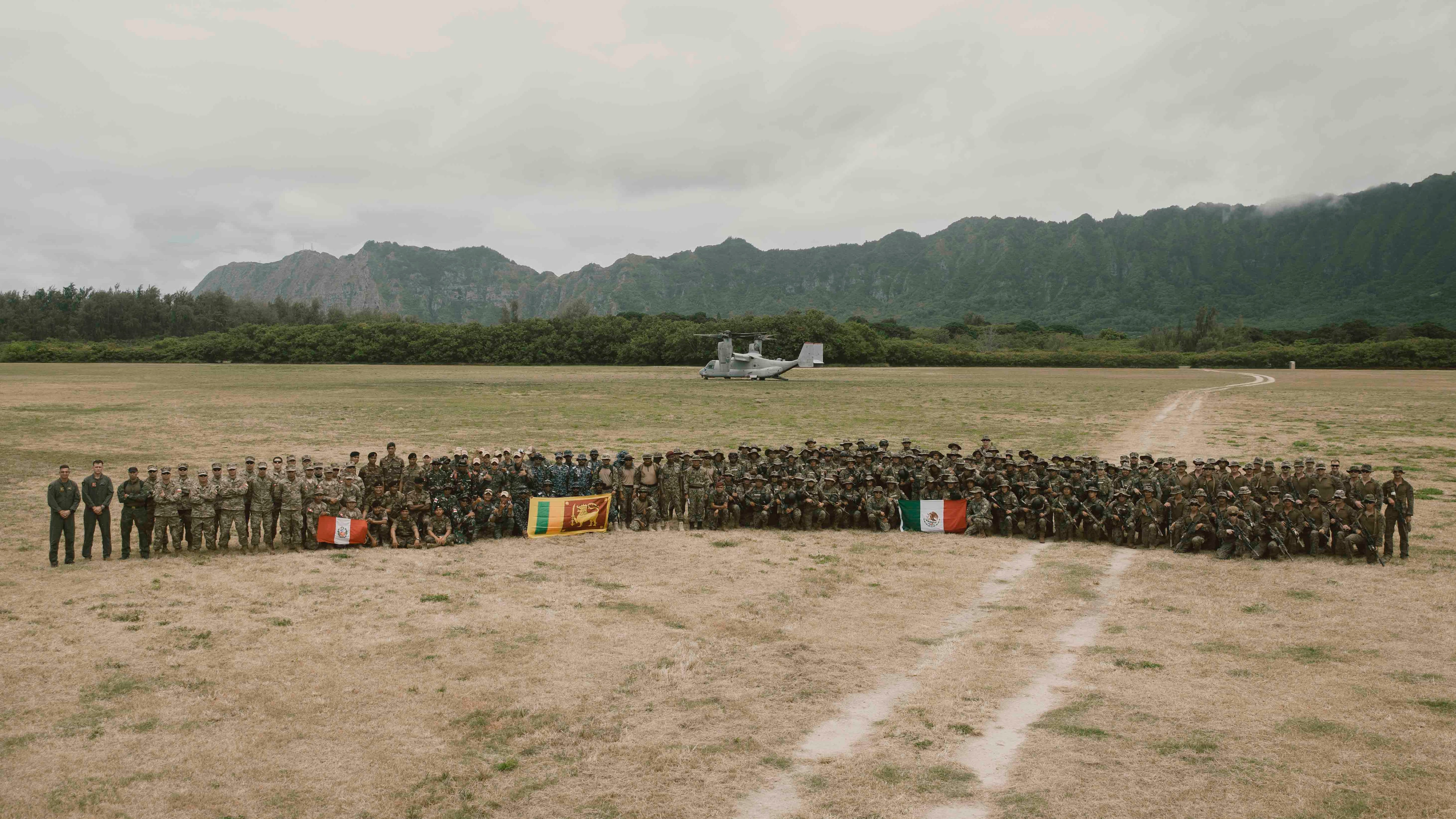 U.S. Marine Corps Lt. Col. Geoffrey Blumenfled, the commanding officer of Marine Medium Tiltrotor Squadron 363, Marine Aircraft Group 24, 1st Marine Aircraft Wing, left, poses for a group photo after Marines with Bravo Company, Battalion Landing Team 1/5, 15th Marine Expeditionary demonstrated a fast-rope insertion to partner forces at Marine Corps Training Area Bellows, Waimanalo, Hawaii, as part of Exercise Rim of the Pacific 2024, July 2. Lt. Col. Blumenfled piloted the MV-22B Osprey while 15th MEU Marines demonstrated to partner forces the ability to conduct fast-rope insertions in austere locations. Twenty-nine nations, 40 surface ships, three submarines, 14 national land forces, more than 150 aircraft, and 25,000 personnel are participating in and around the Hawaiian Islands, June 27 to Aug. 1. The world's largest international maritime exercise; RIMPAC provides a unique training opportunity while fostering and sustaining cooperative relationships among participants critical to ensuring the safety of sea lanes and security on the world's oceans. RIMPAC 2024 is the 29th exercise in the series that began in 1971. (U.S. Marine Corps photo by Cpl. Joseph Helms)
