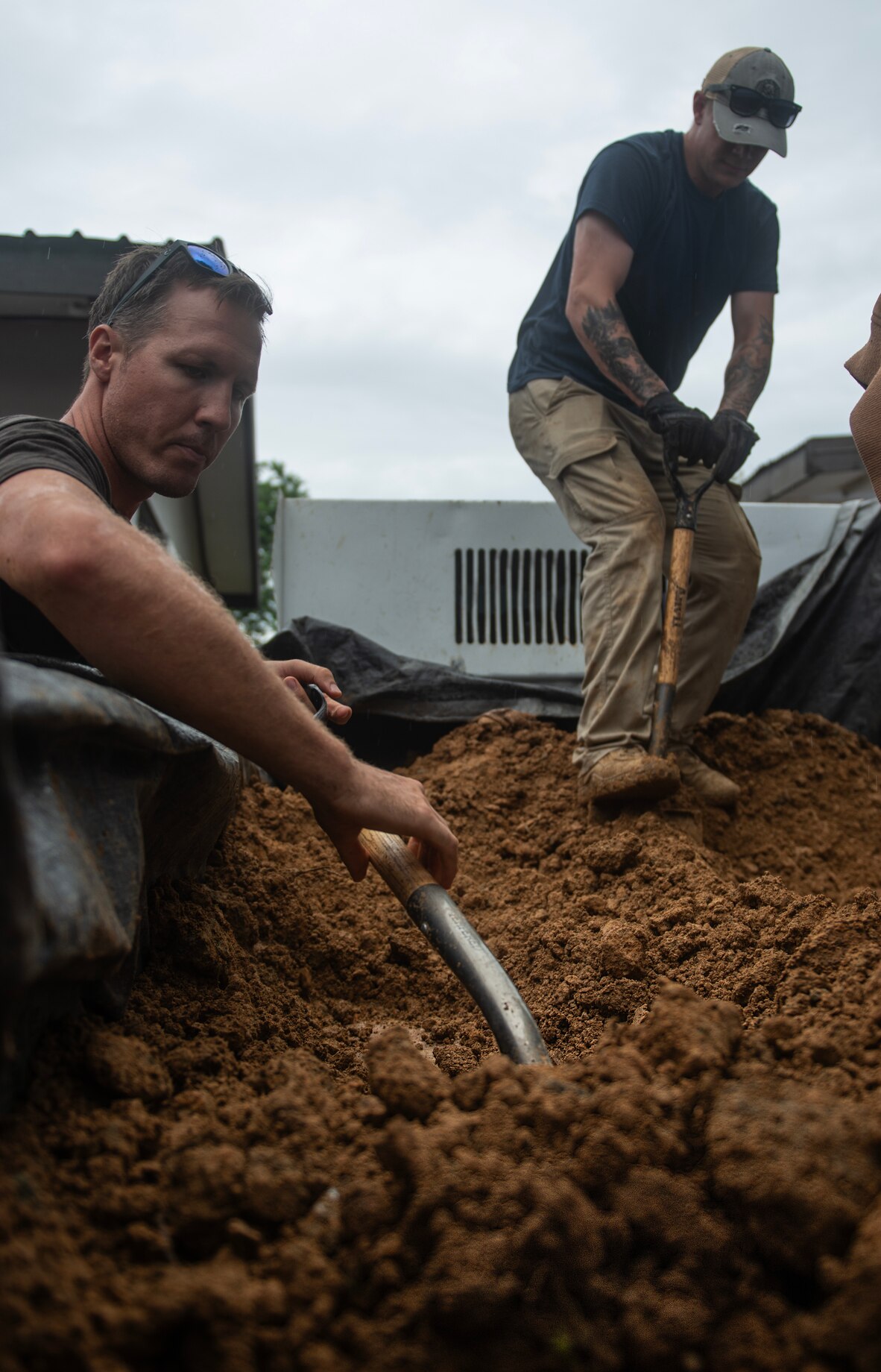 U.S. Air Force Staff Sgt. Paolo DiGirolamo and Senior Airman Dylan Gross, Defense POW/MIA Accounting Agency (DPAA) recovery team members, shovel dirt during a recovery mission in Guadalcanal, Solomon Islands, Aug. 6, 2024. This mission was the first time the screening station and excavation site were geographically separated, requiring trucks to transport the dirt. There are approximately 72,000 U.S. personnel unaccounted for from World War II. Of those, 374 are unaccounted for from Guadalcanal. (U.S. Air Force photo by Staff Sgt. Ariel Owings)