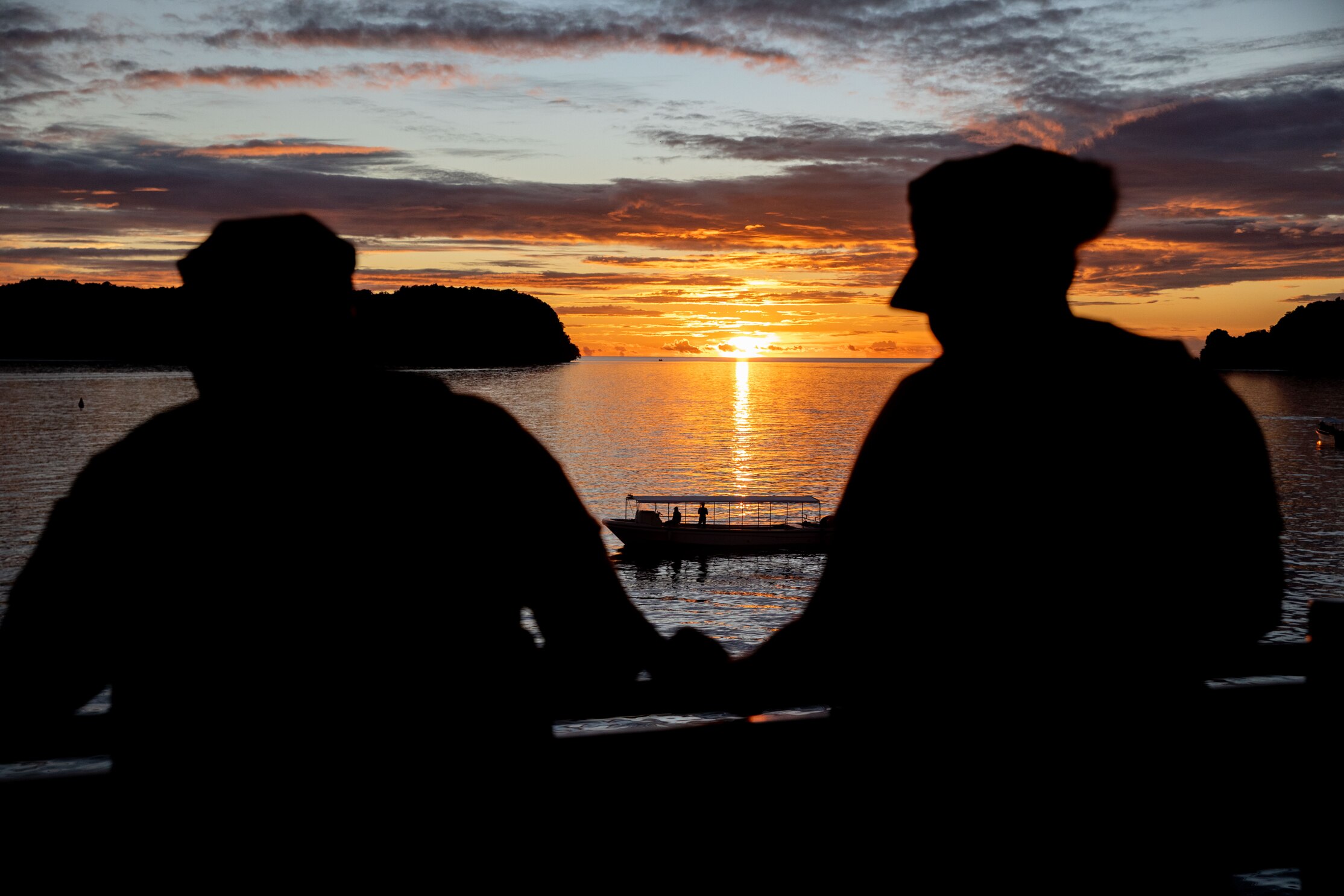KOROR, Palau (Aug. 12, 2024) – Sailors stand watch prior to a reception aboard the U.S. 7th Fleet flagship USS Blue Ridge (LCC 19), during a scheduled port visit to Koror, Palau, Aug. 12, 2024. 7th Fleet is the U.S. Navy's largest forward-deployed numbered fleet, and routinely interacts and operates with allies and partners in preserving a free and open Indo-Pacific region. (U.S. Navy photo by Mass Communication Specialist 2nd Class Belen Saldana)