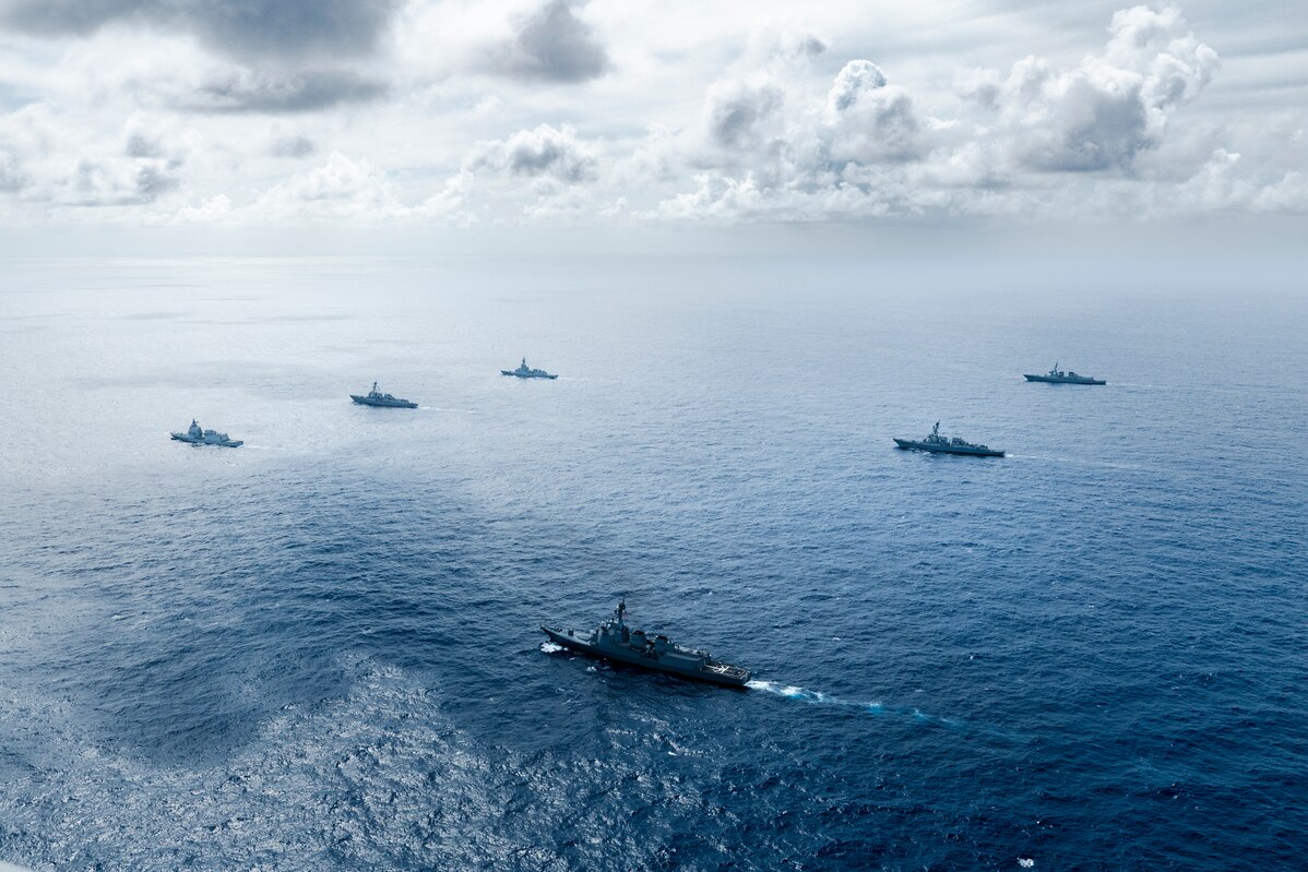 PACIFIC OCEAN (Aug. 11, 2024) – Multinational ships sail in formation during Pacific Dragon 2024, Aug. 11. Hosted by U.S. 3rd Fleet, Pacific Dragon is a biennial exercise in waters around the Hawaiian Islands that enhances participating forces' ability to work together to track and intercept ballistic missiles. (Courtesy photo by LSIS Daniel Goodman)