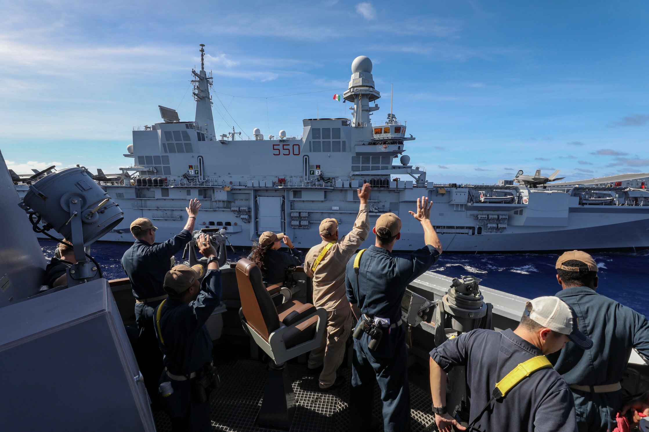 PHILIPPINE SEA (Aug. 18, 2024) – Sailors assigned to the Arleigh Burke-class guided-missile destroyer USS Dewey (DDG 105) wave to Sailors aboard the Italian Navy aircraft carrier ITS Cavour (CVH 550) during a simulated underway replenishment in the Philippine Sea, Aug. 18, 2024. Dewey is forward-deployed and assigned to Destroyer Squadron (DESRON) 15, the Navy’s largest DESRON and the U.S. 7th Fleet’s principal surface force. (U.S. Navy photo by Mass Communication Specialist 1st Class Greg Johnson)