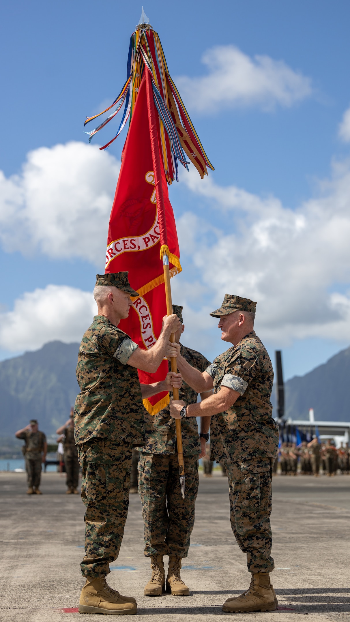 MARINE CORPS BASE HAWAII - U.S. Marine Corps Lt. Gen. James F. Glynn, left, incoming commander, receives the colors from Lt. Gen. William M. Jurney, outgoing commander, both with U.S. Marine Corps Forces, Pacific, during the MARFORPAC change of command ceremony on Marine Corps Base Hawaii, Sept. 12, 2024. With two-thirds of the Marine Corps operating forces assigned, MARFORPAC operates in the U.S. Indo-Pacific Command area of responsibility, the largest Geographical Combatant Command in the U.S. Department of Defense, as the Nation’s expedition force and like-minded allies and partners to preserve and maintain a free and open Indo-Pacific region. (U.S. Marine Corps photo by Staff Sgt. Ash McLaughlin)