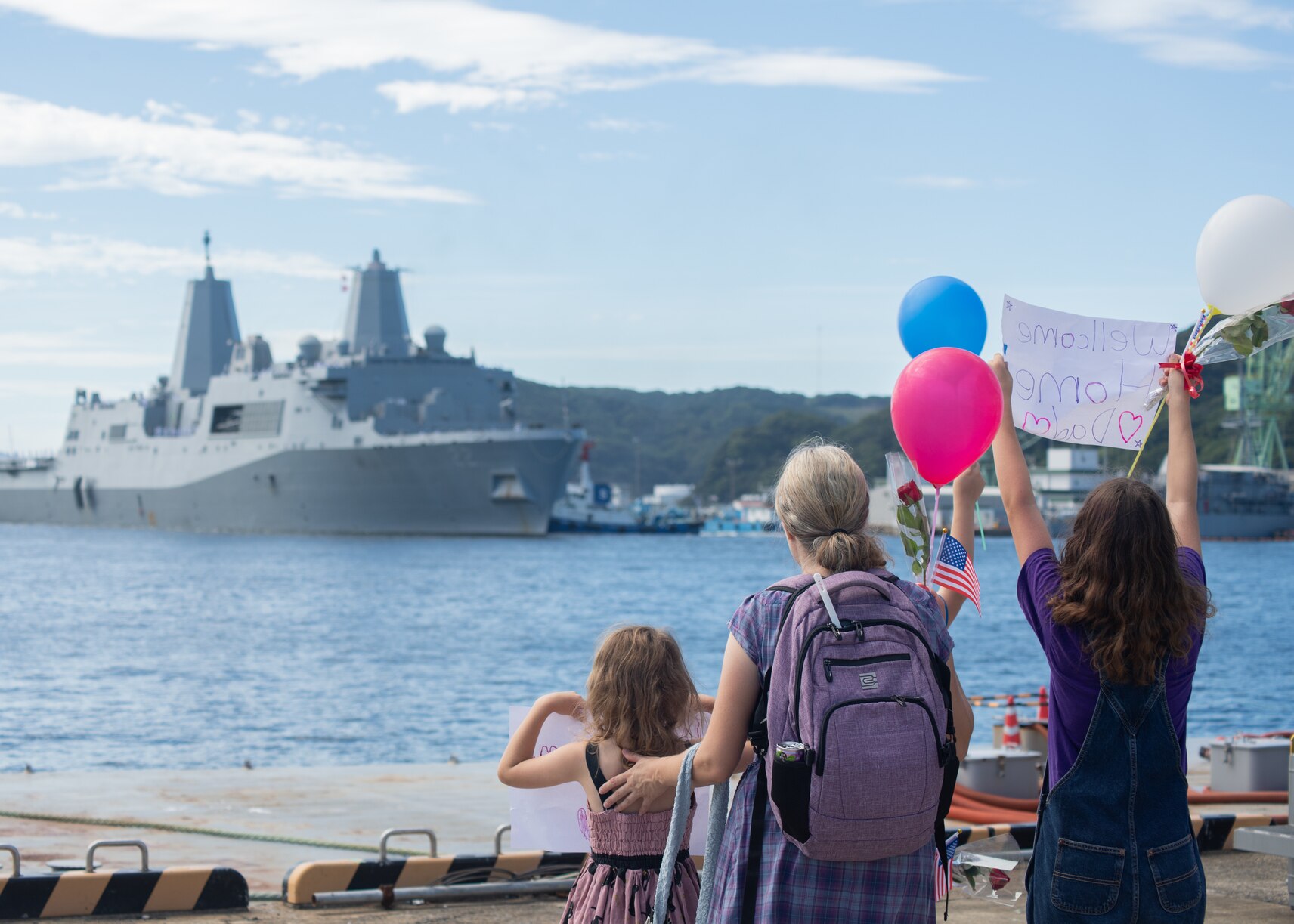 Family members of a USS San Diego (LPD 22) Sailor wave to the ship during the USS San Diego welcome event at Commander, Fleet Activities Sasebo (CFAS) Sept. 19, 2024. San Diego arrived at CFAS to become the newest ship to join U.S. 7th Fleet’s America Amphibious Ready Group in the Forward Deployed Naval Forces-Japan (FDNF-J). (U.S. Navy photo by Mass Communication Specialist 2nd Class Sophia H. Bumps)