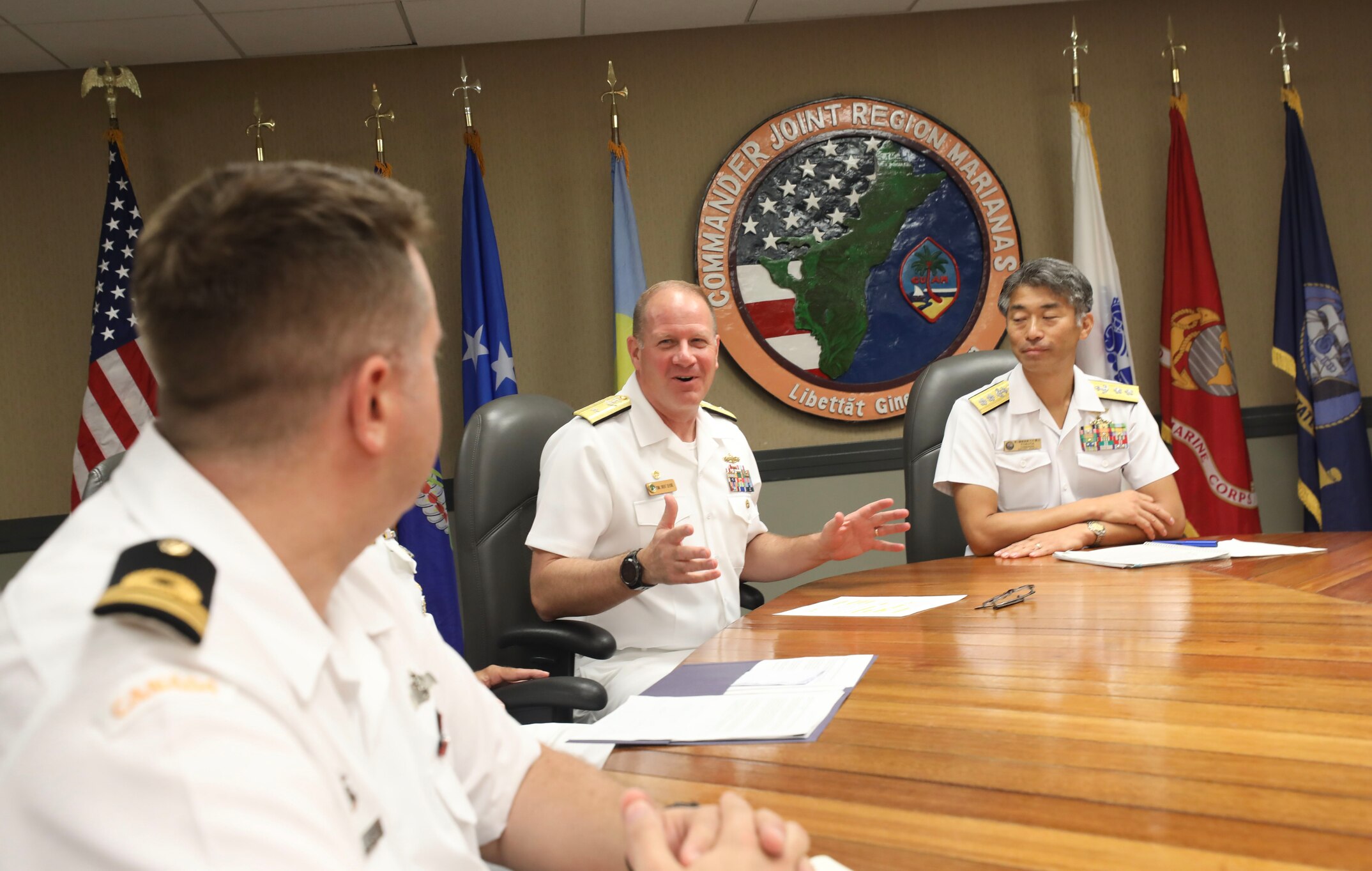ASAN, Guam (Aug. 24, 2024) – Rear Adm. Brent DeVore, Commander, Joint Region Marianas (JRM), speaks at a media engagement marking the beginning of exercise Pacific Vanguard 2024 at JRM headquarters, Aug. 24, 2024. DeVore is joined by Japan Maritime Self-Defense Force Rear Adm. Kazushi Yokota, commander of Escort Flotilla 3, right, and Lt. Cmdr. Trevor Robinson of the Royal Canadian Navy’s exercise control staff, left. Pacific Vanguard is an opportunity for like-minded forces to strengthen their skills in maritime operations, anti-submarine warfare operations, air warfare operations, live-fire missile events, and advanced maneuvering scenarios in the Mariana Islands Range Complex. (U.S. Navy photo by Mass Communication Specialist 1st Class Greg Johnson)