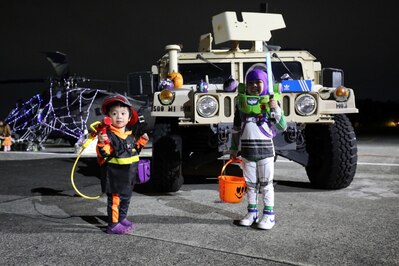 Children dressed as a firefighter and Buzz Lightyear pose for a photo in front of a Humvee during the combined “Trunk-or-Treat” and “Haunted Hangar” event, which the U.S. Army Aviation Battalion Japan and U.S. Army Garrison Japan co-hosted Oct. 26 at Kastner Airfield on Camp Zama, Japan.
